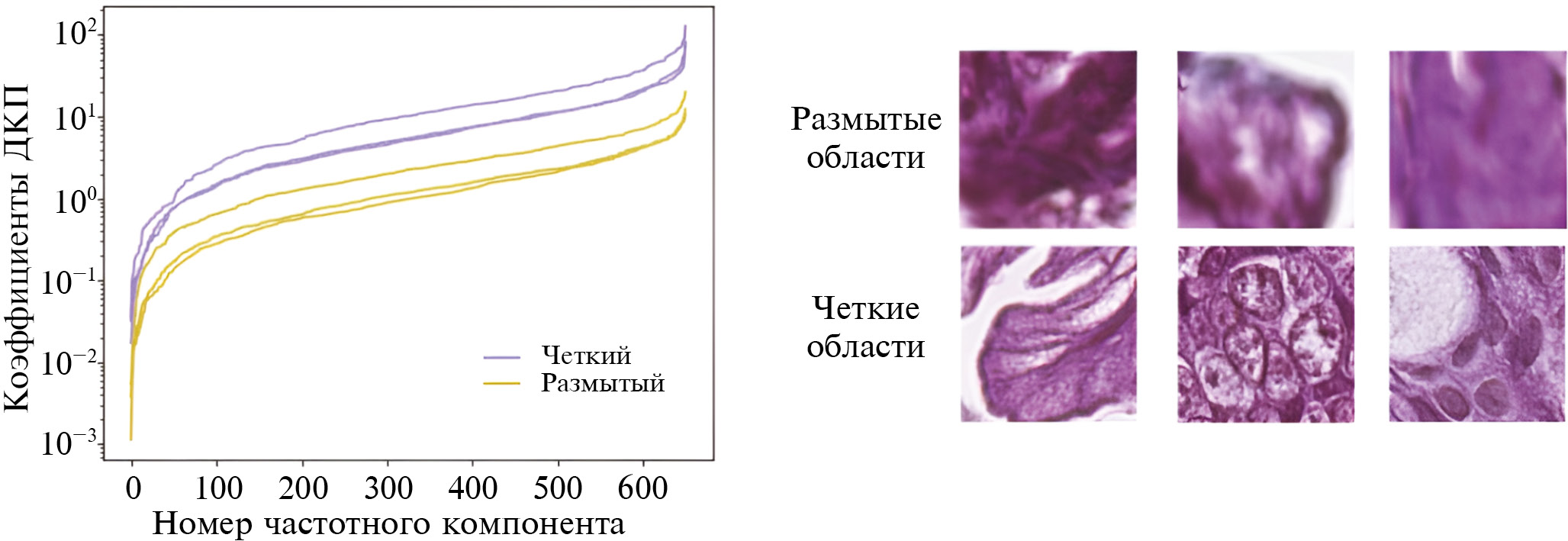 Дискретное косинусное преобразование (ДКП) – это преобразование, которое преобразует сигнал (или в данном случае изображение) из пространственного представления в частотное. Широко известно, что размытие приводит к уменьшению амплитуд высокочастотных коэффициентов ДКП изображения. На рис. 1 приведен график отсортированных по возрастанию абсолютных значений амплитуд высокочастотных коэффициентов ДКП для резких и размытых участков гистологических изображений, демонстрирующий заметную разницу в их значениях. Все последующие шаги описываемого подхода основаны на этом различии.