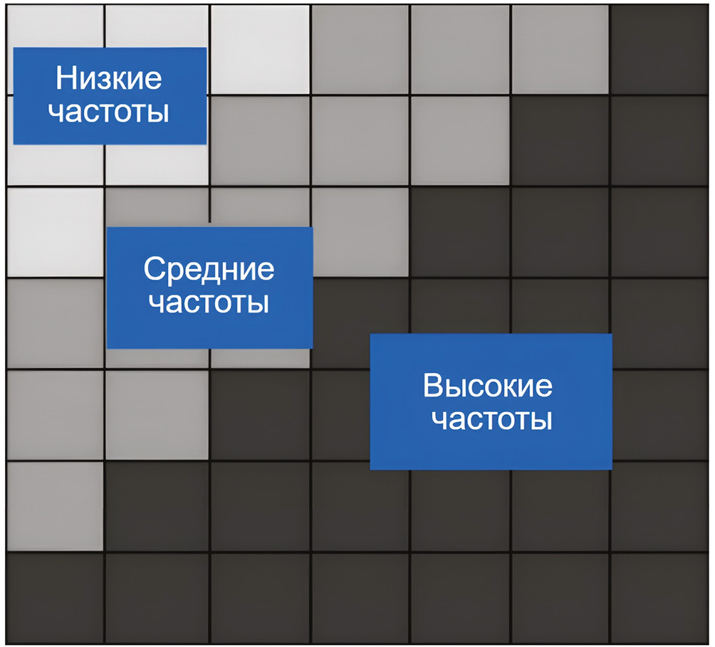 Рис. 2. Иллюстрация коэффициентов ДКП для блока при их разделении на группы соответствия различным частотам