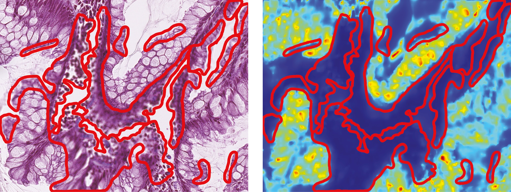 Рис. 3. Визуализация карты размытия для гистологического изображения с отмеченными красным областями размытия