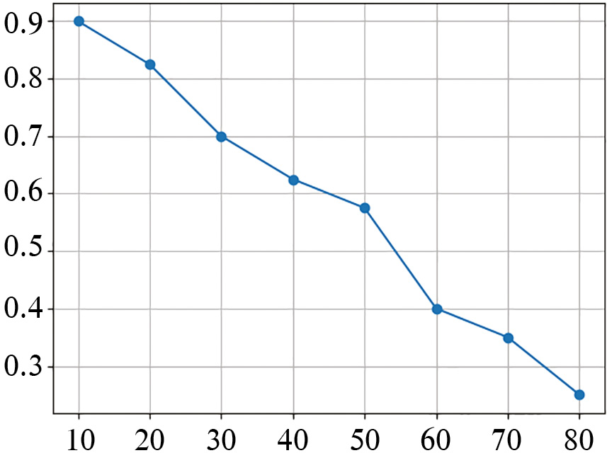 - Для всех остальных патчей анализируется пара значений (V, SI). Патчи из обучающей выборки были сгруппированы по значению V, для каждой из групп путем максимизации метрики F1 было определено пороговое значение SI(V), ниже которого патч классифицируется как размытый. Полученный график SI(V) приведен на рис. 4.