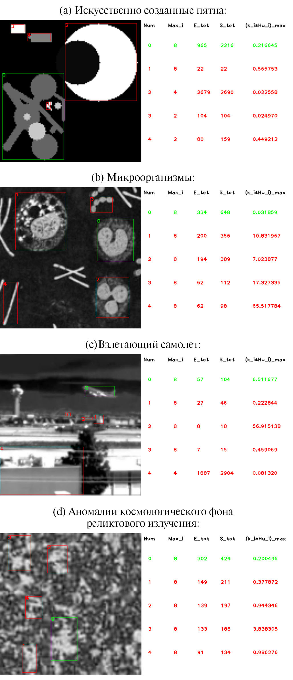 На рис. 4 показаны результаты работы алгоритма по вычислению сложности на искусственно-созданных пятнах, а также на изображениях реальных объектов: микроорганизмов, взлетающего самолета и аномалии космологического фона реликтового излучения.