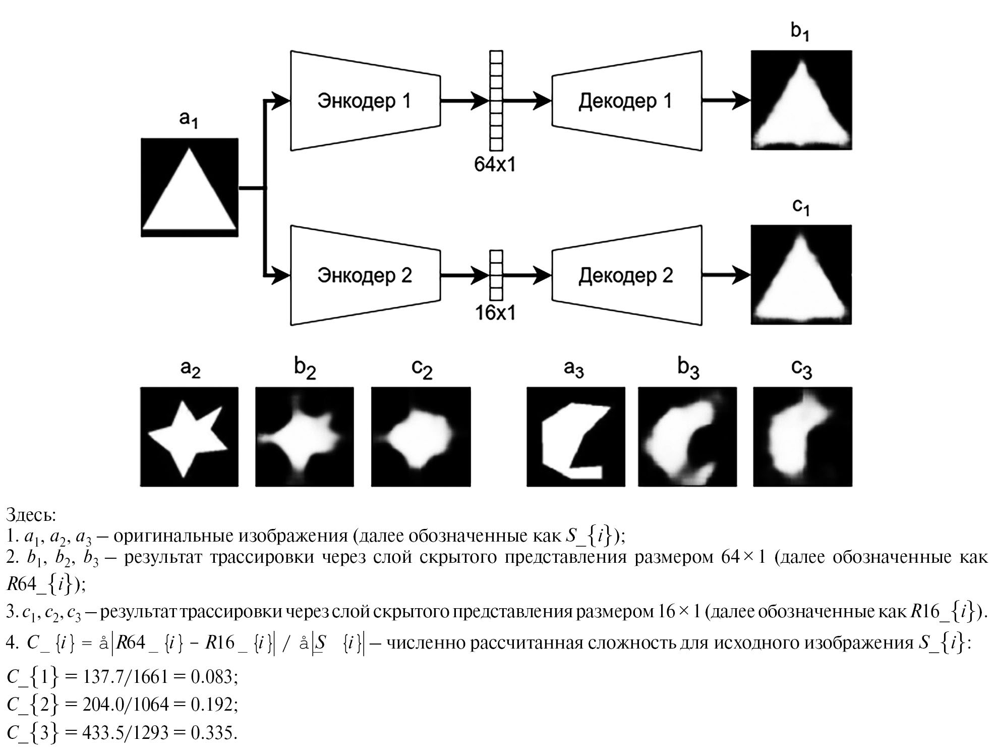 Нейронной сетью выступает предварительно обученный вариационный автоэнкодер (ВАЭ), предложенный в работе [7]. Нейронная сеть решает задачу воспроизведения на выходном слое изображения, поступившего на входной. Входное изображение рассматривается с позиции тензорного представления и трассируется через нейронную сеть, включающую в себя энкодер, слой скрытого представления и декодер. Тензор в энкодере последовательно сжимается по ширине и высоте слоями свёртки (Conv2d), активации (ReLU) и прореживания (MaxPooling2d), при этом увеличивается количество слоев (глубина) тензора. Слой скрытого представления (latent layer) является “бутылочным горлышком” системы, в нем сосредоточена сжатая информация о входном изображении. Декодер последовательно выполняет развертку данных. В настоящем (частном) случае выходное изображение, поступающее на дальнейшую обработку из декодера, согласовано по высоте и ширине со входным изображением. Размер скрытого слоя влияет на способность нейронной сети воспроизводить (реконструировать) поступающие на входной слой изображения. В экспериментах работы [7] размер скрытых слоев ограничен 16 и 64 нейронами для двух ВАЭ. Для оценки сложности используется сумма абсолютной попиксельной разницы между продуктами трассировки входного изображения через два ВАЭ с разным размером слоя скрытого представления. Сложность вычисляется как частное суммы абсолютных отклонений и интегральной яркости исходного изображения. Нужно отметить, что авторами работы [7] не рассматриваются альтернативные методы оценки схожести продуктов трассировки ветвей модели. На рис. 4 представлена схема архитектуры нейронной сети, состоящей из двух независимых ветвей ВАЭ, а также представлен пример трассировки некоторого бинарного изображения и расчета его сложности. Схема взята из оригинальной публикации [7].