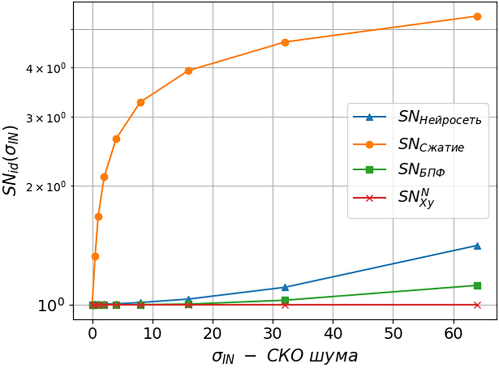 где: SN – стабильность метода при воздействии шума; id – идентификатор метода; σIN – СКО шума; M – оператор вычисления среднего значения по статистической выборке случайной величины; Cid (σIN) – сложность, оцененная методом id при добавлении шума с СКО σIN; – сложность, оцененная методом id на исходном (оригинальном) изображении;