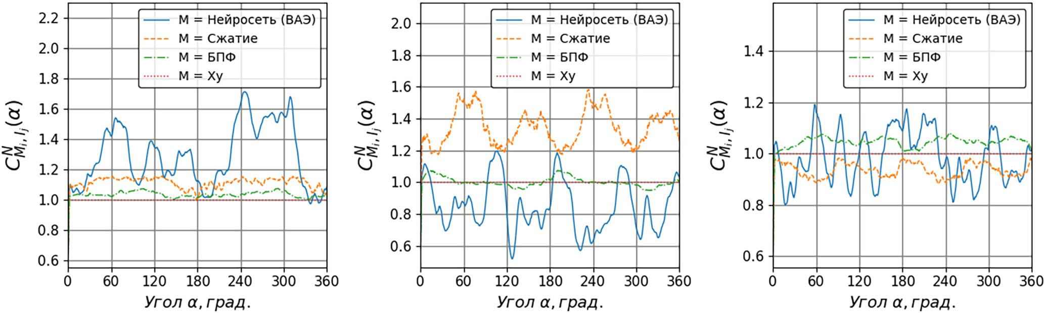 Далее объект выделялся по содержимому. Шаг поворота составлял δα = 1°, при визуализации сглаживались высокочастотные колебания показаний одномерным усредняющим фильтром с размером ядра равным ∆α = 5°. Использовались три обозначенных ранее тестовых изображения рис. 5. На рис. 8 представлены три блока графиков, каждый блок соответствует своему тест-изображению из рис. 5. Графики показывают изменение относительной сложности для разных методов при вращении тест-объектов.