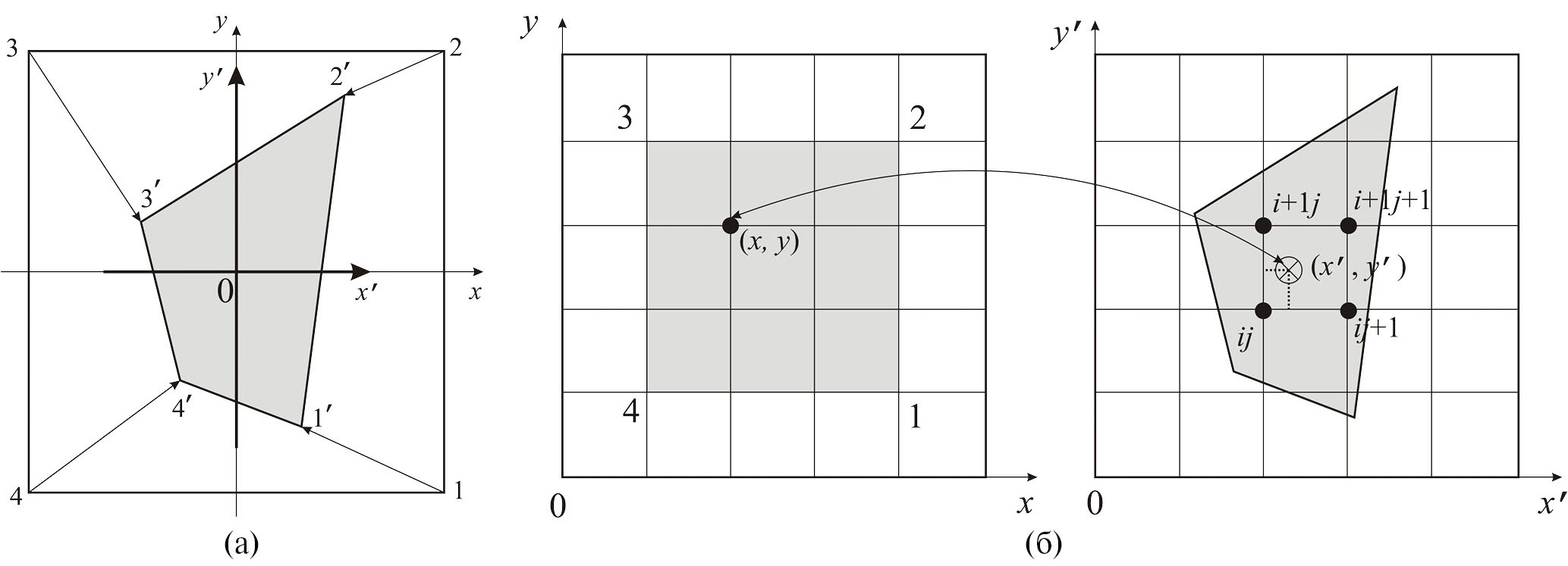Рис. 1. Преобразование четырехугольника (1ʹ2ʹ3ʹʹ) в квадрат (1234): (а) схема обратного преобразования, (б) схема вычисления интенсивности пикселей.