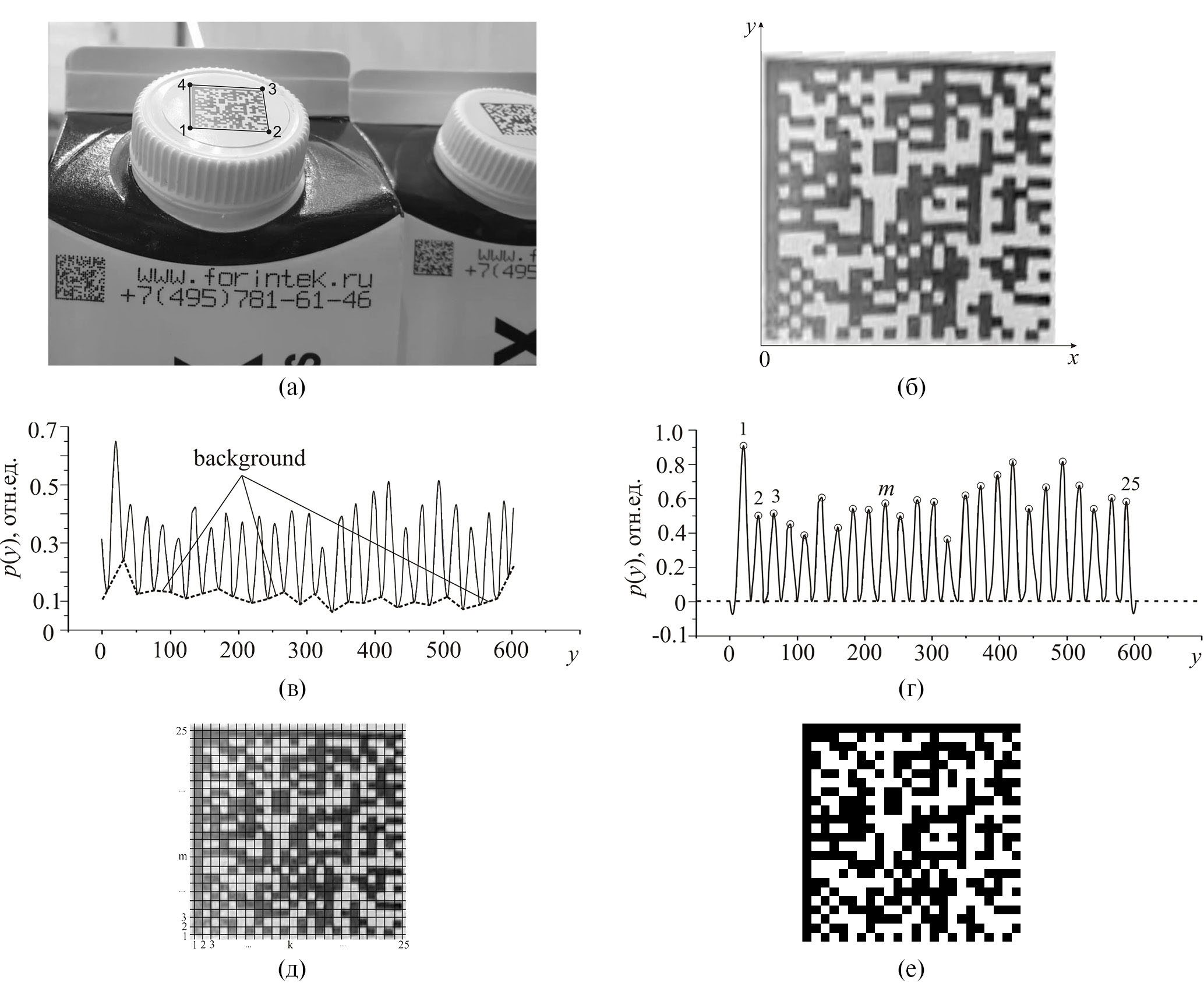 Рис. 3. Трансформация и дискретизация DataMatrix: (а) – исходный для обработки локализованный код, (б) – результат трансформации четырехугольника (1234) в канонический квадрат, (в) – средний модуль производной по y интенсивности квадратного кода и кусочно-линейный фон (background), (г) – средний модуль производной после вычитания кусочно-линейного фона, (д) – наложение сетки с n × n = 24 × 24 ячейками, (е) – код с бинарными модулями.