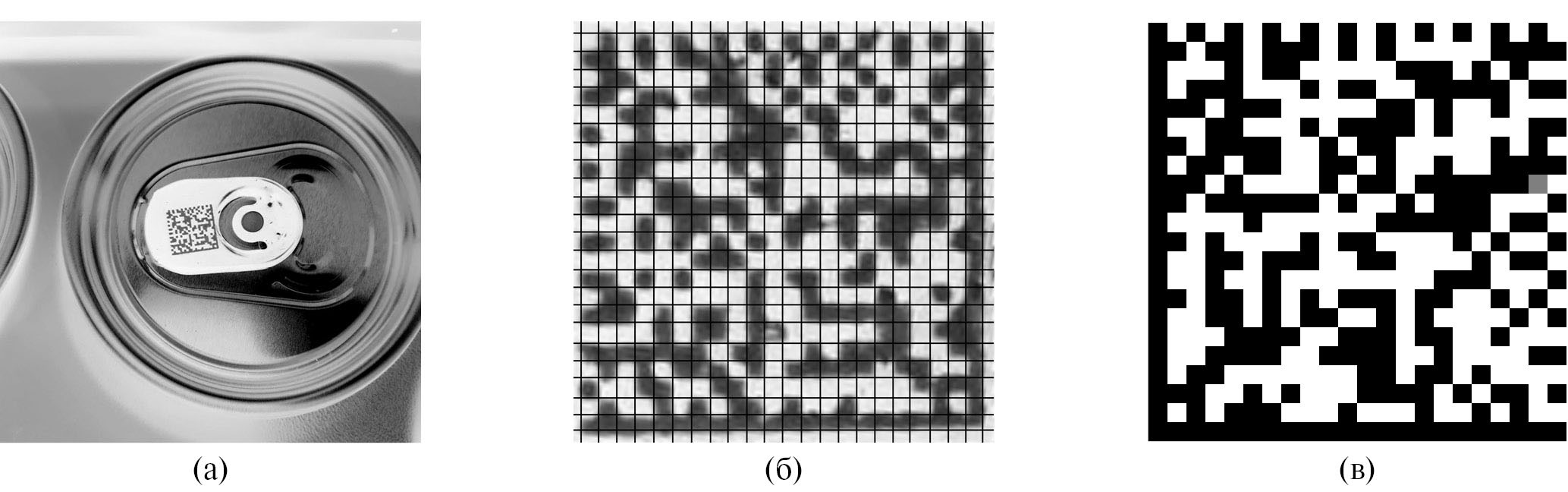Рис. 5. Результаты полного цикла распознавания DataMatrix низкого качества: (а) – исходное изображение кода на жестяной банке, (б) – код после обнаружения и локализации, трансформации и дискретизации, (в) – бинаризованный канонически ориентированный код.