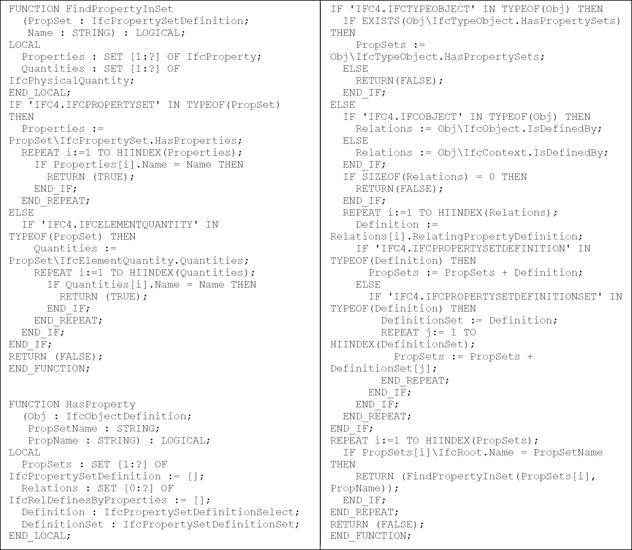 Рассмотрим возможное представление паттерна Property на языке EXPRESS. При этом для краткости ограничимся вариантом, где указываются только имена набора свойств и свойства для проверки их наличия в объекте без указания допустимого типа значений и области их определения. Соответствующая универсальная функция HasProperty применяется к объектам-наследникам типа IfcObjectDefinition (см. рис. 4). Поскольку в модели данных IFC наборы свойств назначаются по-разному различным потомкам типа IfcObjectDefinition: контекстам IfcContext, объектам IfcObject и их типам IfcTypeObject (в первых двух случаях – через отношение IfcRelDefinesByProperties, в последнем – напрямую), в ней сначала формируется вспомогательная коллекция назначенных наборов свойств PropSets, а затем осуществляется поиск нужного набора и свойства в нем по заданным именам. Функция для поиска свойства в наборе по имени FindPropertyInSet является вспомогательной.
