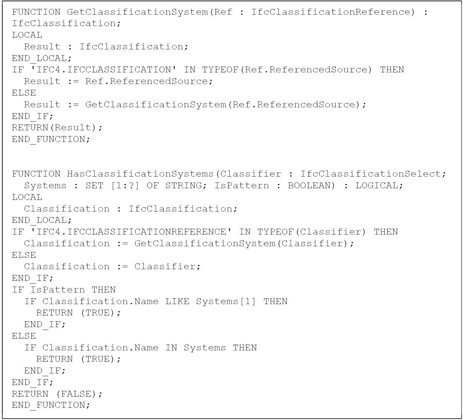 Для отношений другого вида можно написать аналогичные функции на языке EXPRESS, которые в статье не приводятся для краткости изложения. Также существует функция PartOf, которая в зависимости от типа передаваемого объекта и списка типов отношений вызывает упомянутые вспомогательные функции для проверки его вхождения в те отношения, которые задаются входным параметром и являются допустимыми для его типа согласно спецификации IFC.