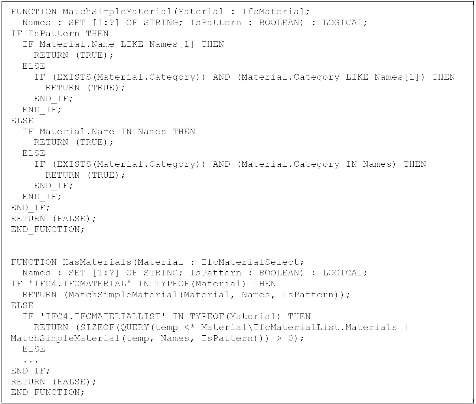 Рассмотрим, как можно представить паттерны IDS с помощью конструкций языка EXPRESS. Подобные конструкции (логические выражения и функции) используются для указания контекста применимости требований (выделения множества объектов для проверки их выполнимости) и формулирования самих требований, выражаемых простой конъюктивной формой в IDS. Тем самым, представимость паттернов IDS конструкциями EXPRESS служит обоснованием формализации всего стандарта IDS. Заметим, что при отображении в EXPRESS значений следует учитывать их реальные типы данных в соответствии со схемой IFC, поскольку типы данных в XML ограничиваются только строками, числами и булевыми значениями.