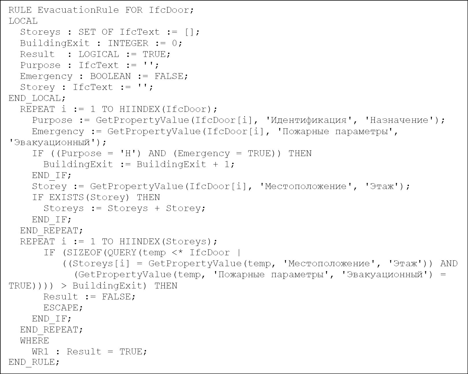 В первом цикле подсчитывается количество эвакуационных выходов из здания, а также формируется множество идентификаторов этажей, на которых располагаются двери. Во втором цикле по этажам здания с помощью операции запроса, применяемой к экстенту типа IfcDoor, формируется множество эвакуационных выходов на каждом этаже, подсчитывается число элементов в нем и сравнивается с подсчитанным ранее количеством эвакуационных выходов из здания.