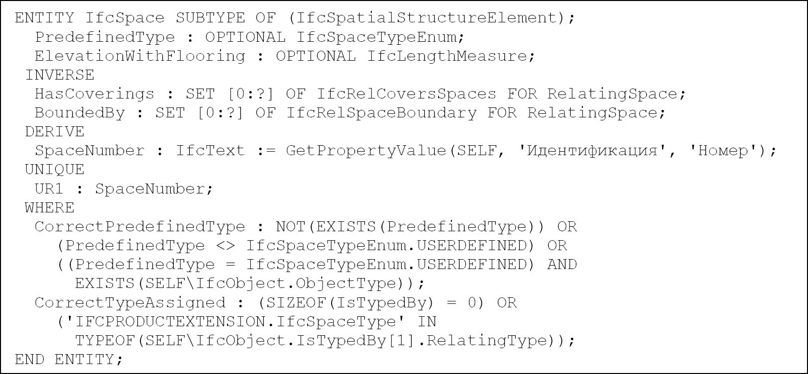 Согласно требованиям ЦГЭ.ЦИМ-3.0 [50] помещения (тип IfcSpace) в модели должны иметь уникальный номер, задаваемый свойством “Номер” в наборе “Идентификация”. Его можно представить в виде правила уникальности в объектном типе IfcSpace, как показано на рис. 9, переопределив данное свойство как производный атрибут SpaceNumber в данном объектном типе, поскольку в EXPRESS уникальность может устанавливаться только для атрибутов. Для извлечения значения свойства используется определенная ранее функция GetPropertyValue.