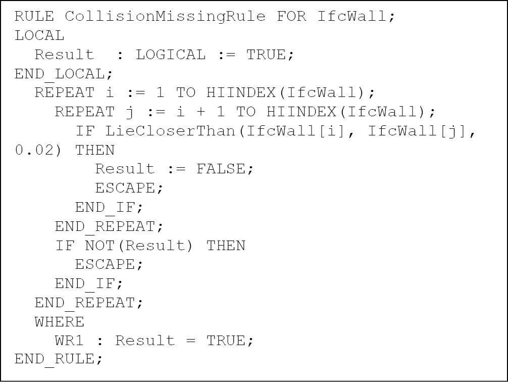 Рассмотрим, как можно представить требования об отсутствии геометрических коллизий между строительными элементами, например, приведенные в ЦГЭ.ЦИМ-3.0 для стен. Пусть реализована функция для проверки пересечения двух объектов, имеющих геометрическое представление (в IFC это объекты, чей тип является производным от IfcProduct) со следующей сигнатурой: