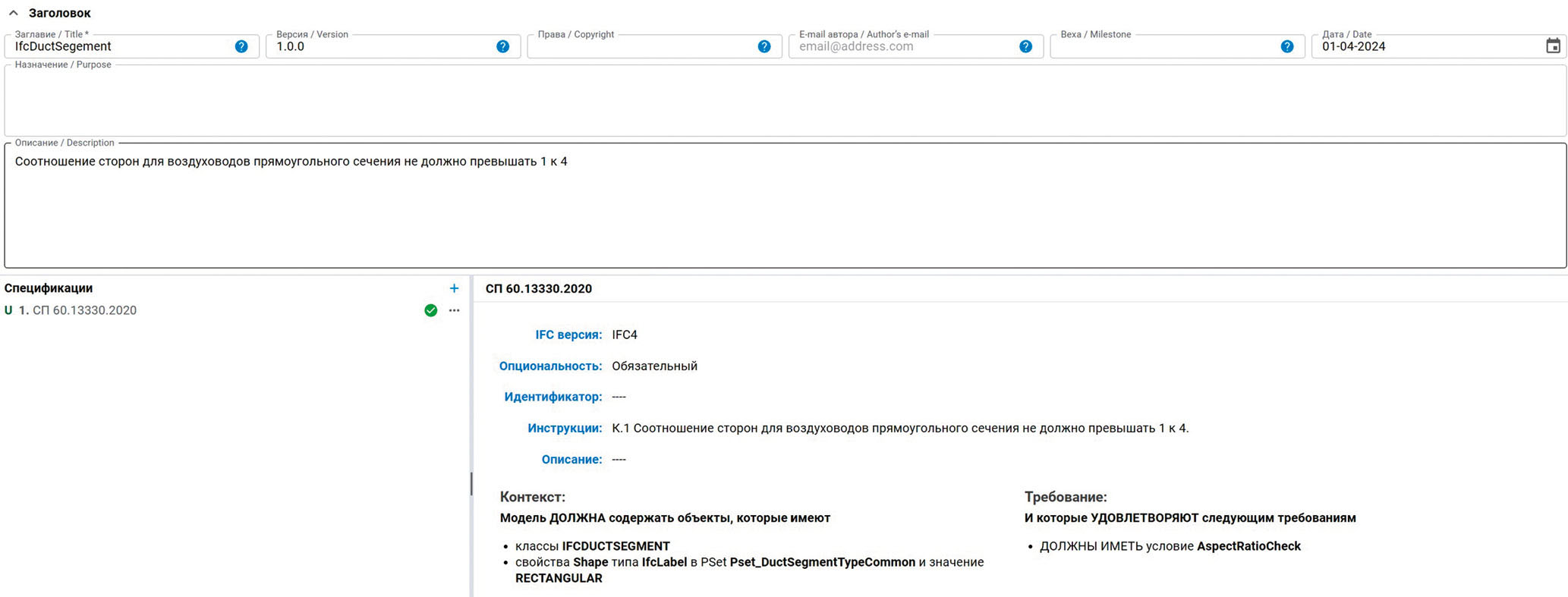 Для реализации предлагаемого формального подхода в поддерживаемый набор стандартных IDS паттернов добавлено три новых паттерна, соответствующих декларативным правилам языка EXPRESS. При инстанциировании соответствующего правила в нижней части диалога отображаются элементы для ввода его названия и тела спецификации на языке EXPRESS. Парсер позволяет оперативно выявить допущенные пользователем синтаксические ошибки, а семантический контроль осуществляется на этапе верификации цифровой модели и интерпретации спецификации требования. На приведенном скриншоте показано представление требования соотношения сторон для воздуховодов прямоугольного сечения, ранее рассмотренного в разделе 5.