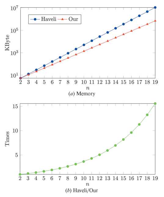 Из данных, представленных на рис. 2a, можно сделать вывод, что предложенный алгоритм позволяет сократить объем памяти в среднем в 7.89 раза. Линия тренда для данных, представленных на рис. 2b, равна 0.0656n2 – 0.4452n + 2.0912 с коэффициентом детерминации R2 = 0.9925. Таким образом, можно сделать вывод, что пространственная сложность уменьшилась с O(n4) до O(n2) для произведения матриц размера n × n. Учитывая, что для произведения квадратных матриц размера n × n необходимо вычислить n2 скалярных умножений и 2n2 циклических сдвигов векторов, пространственная сложность алгоритма скалярного умножения с зашифрованными данными снижается с O(n2) до O(n).