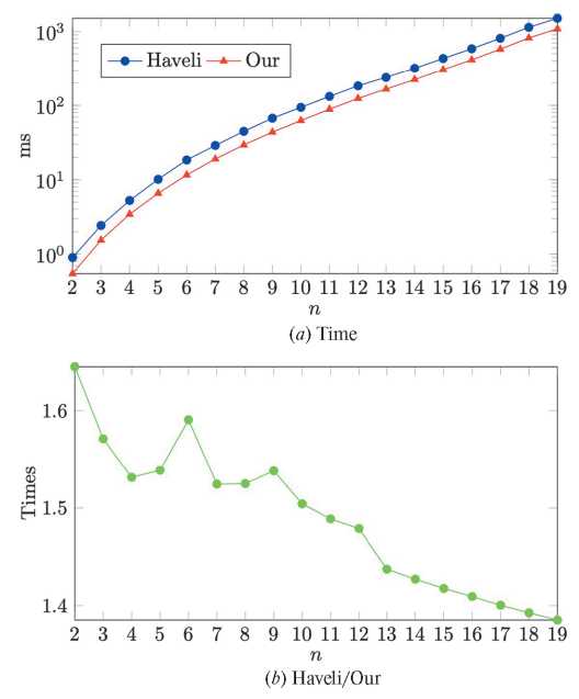 Линии тренда зависимости времени от n для алгоритма Хавели 0.0634n4 – 1.8561n3 + 20.897n2– – 88.794n + 118.56, для предложенного алгоритма 0.0461n4 – 1.3405n3 + 14.955n2– 63.491n + 84.81 с коэффициентом детерминации для обеих линий равным R2 = 0.9995 (рис. 3a). Асимптотически выигрыш во времени при увеличении n равен