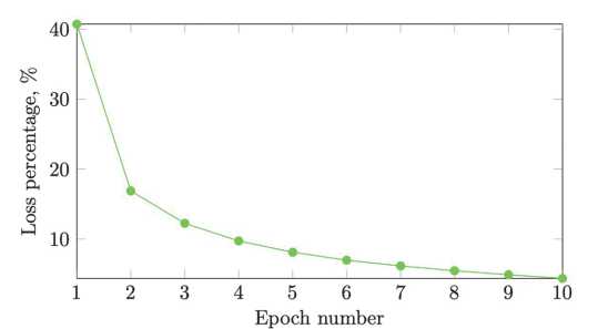 На рис. 4 показана динамика потерь нейронной сети в процессе обучения для 10 эпох. По оси абсцисс откладывается номер теста, равный количеству эпох (от 1 до 10), а по оси ординат – количество потерь. На графике видно уменьшение потерь с каждой последующей эпохой, что свидетельствует об адекватном поведении модели при использовании нового алгоритма обучения.