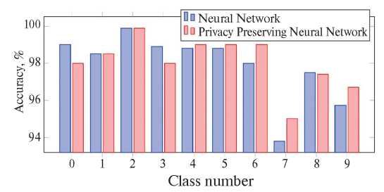 Результаты экспериментов показывают, что нейронная сеть демонстрирует высокую точность как в обычном, так и в зашифрованном режимах, причем в зашифрованном режиме общая точность несколько повышается. Это говорит о том, что применение гомоморфного шифрования не оказывает существенного негативного влияния на способность модели к классификации. Кроме того, тот факт, что в некоторых классах зашифрованная СНС показывает более точные результаты, требует дополнительных исследований.