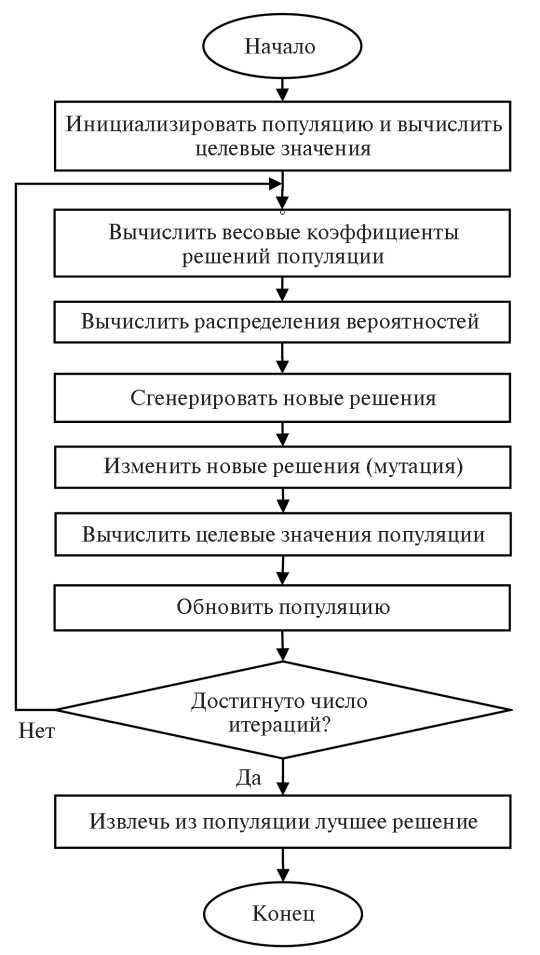 С помощью полученных распределений генерируется новая популяция и подвергается мутации, чтобы предотвратить преждевременную сходимость. Далее популяция обновляется лучшими решениями текущей и новой популяции. После этого снова рассчитываются весовые коэффициенты решений, и продолжается новый цикл. По завершении заданного количества итераций из популяции выбирается лучшее решение.