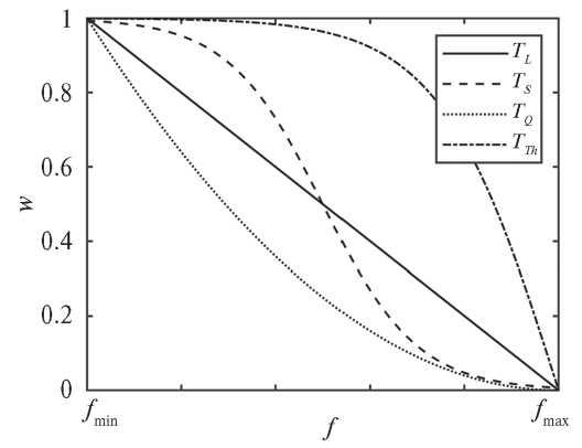 На этапе инициализации определяется начальная популяция решений Pop случайным или иным образом. Далее рассчитываются весовые коэффициенты решений популяции w. Весовой коэффициент принимает значение из диапазона [0, 1], чем меньше целевое значение решения, тем больше значение w. Для того чтобы сформировать весовые коэффициенты из целевых значений предлагается использовать функции трансформации. В качестве таких функций, например, могут быть использованы следующие: TL – линейная функция, TS – сигмоида, TQ – квадратичная функция, TTh – гиперболический тангенс. Графики функций представлены на рис. 2. Область определения функций ограничена отрезком [fmin, fmax], где fmin и fmax – минимальное и максимальное значение целевой функции в популяции соответственно, а f – текущее значение. Аналитические выражения функций трансформации показаны ниже: