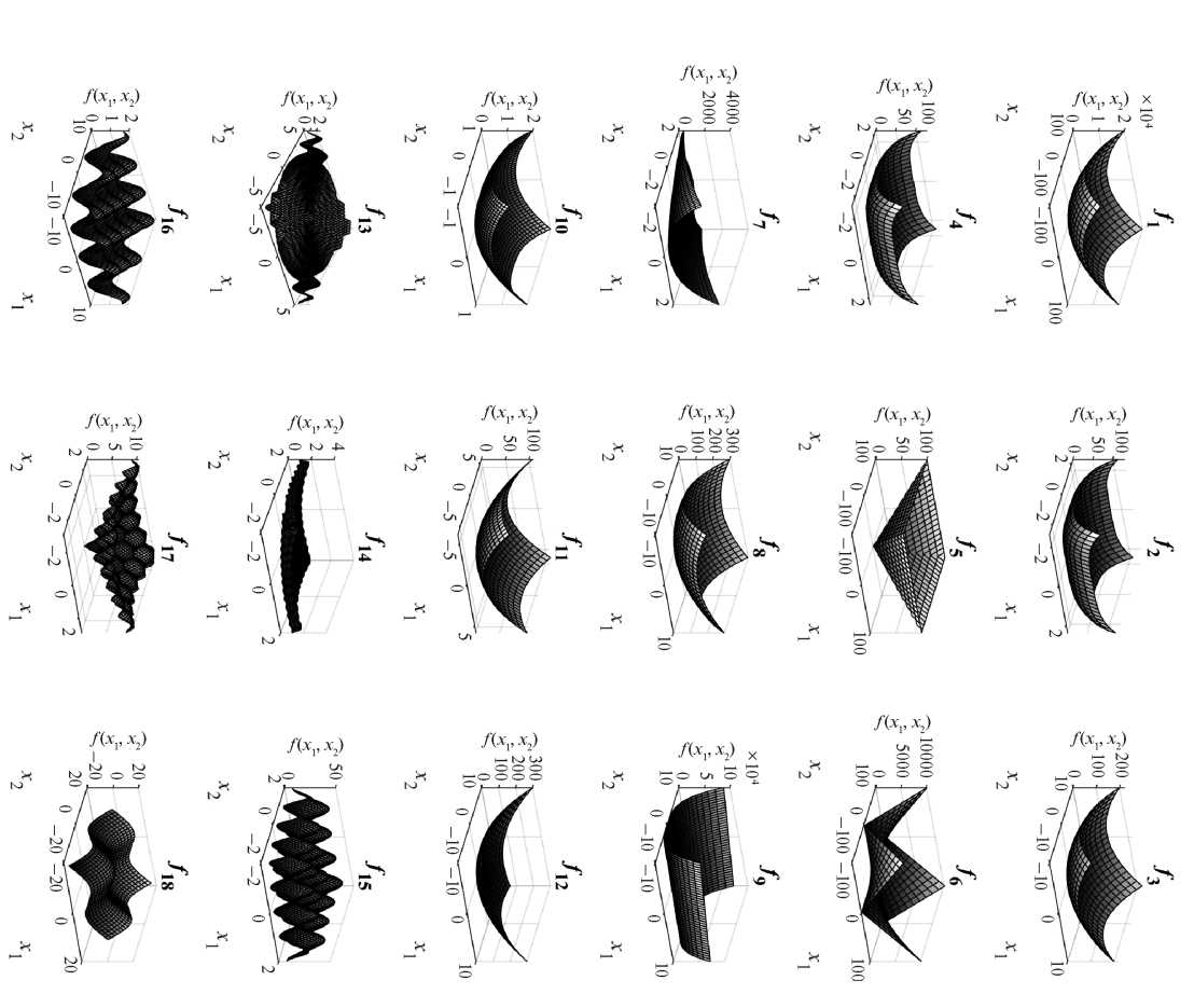 В настоящем разделе представлены эксперименты c разработанным дискретным алгоритмом оптимизации на основе распределения вероятностей с трансформацией целевых значений. Алгоритм тестировался для бинарной проблемы оптимизации, т. е. когда переменные принимают только два значения. В экспериментальном исследовании использовались восемнадцать различных унимодальных и мультимодальных эталонных функции, широко применяемых для тестирования алгоритмов оптимизации [28, 44–46]. В табл. 1 представлены их характеристики, а на рис. 3 графики в двумерном пространстве поиска. Функции f1–f11 являются унимодальными, т. е. содержат только один глобальный оптимум. Функции f12–f18 являются мультимодальными и содержат один глобальный и множество локальных оптимумов, число которых экспоненциально растет с увеличением размерности задачи. Эксперимент проводился согласно методике работы [44].