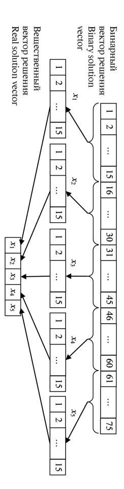 Поскольку алгоритм является дискретным и оперирует в эксперименте бинарными векторами решений, элементы которых принимают значение 0 или 1, проводится кодировка вещественных значений бинарным вектором. Процедура перевода бинарного вектора решения в значения вещественных переменных представлена на рис. 4. Данная процедура выполняется всякий раз, когда алгоритму необходимо рассчитать значение целевой функции. Количество переменных в эксперименте 5, количество битов для кодирования значения каждой переменной – 15. Таким образом, величина бинарного вектора решений составляет n = 5 × 15 = 75 элементов. Количество дискретных значений, которое может иметь каждая переменная, соответствует 215. Эти значения определяются с помощью равномерного квантования на диапазоне поиска переменной. Шаг дискретизации определяется следующим образом:
