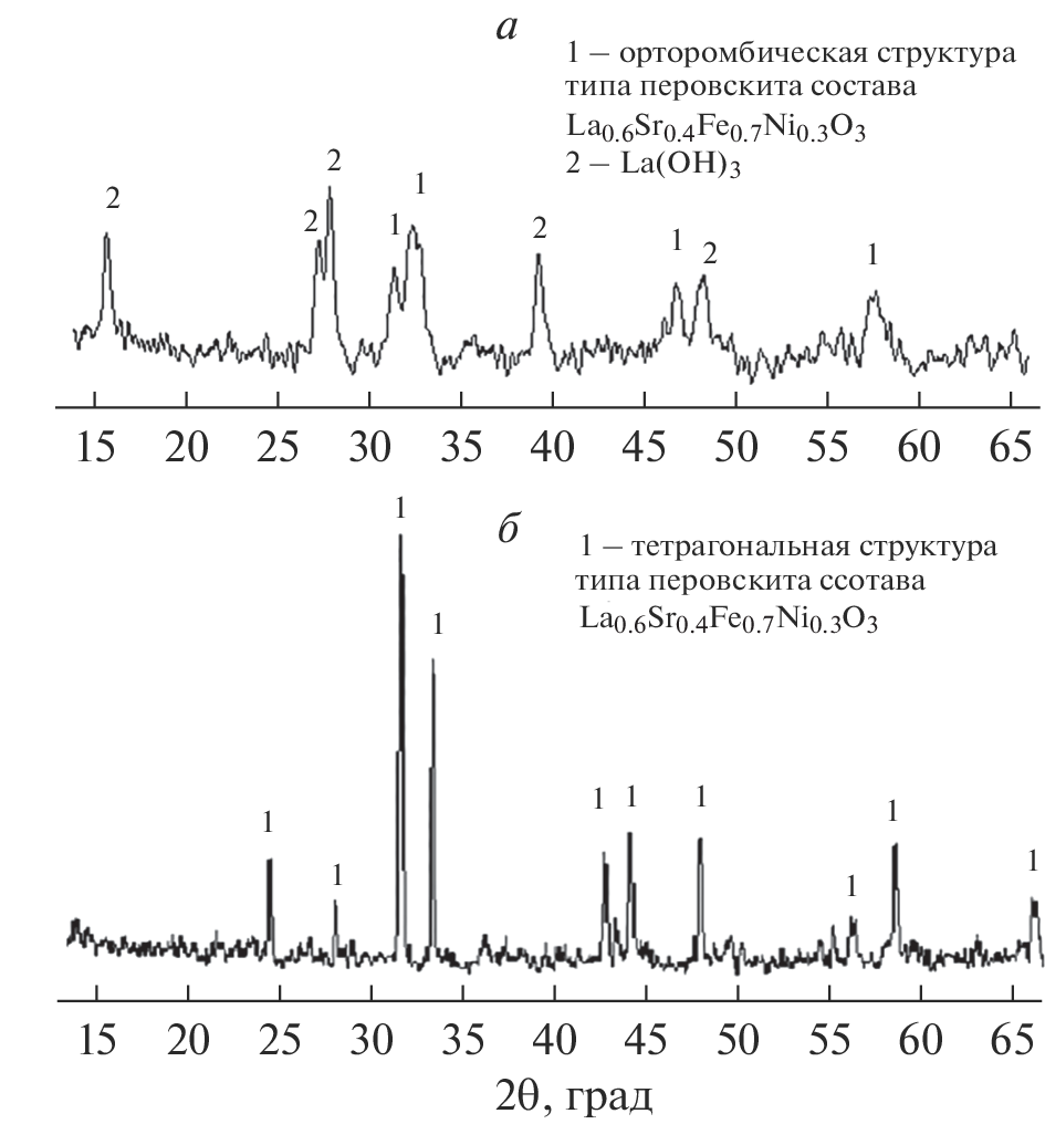 Методом совместной кристаллизации азотнокислых солей с ультразвуковой обработкой синтезированы высокодисперсные мезопористые порошки состава: La1 – xSrxNiO3 – δ, La1 – xSrxCoO3 – δ и La1 – xSrxFe0.7Ni0.3O3 – δ (x = 0.30; 0.40). На их основе получены керамические наноматериалы заданного состава с ОКР ~ 65–69 нм (1300°С). Керамика, обожженная при 1300°С являяется однофазной и обладает тетрагональной и орторомбической структурой типа перовскита в системе La2O3‒SrO‒Ni(Co,Fe)2O3 – δ. Твердые растворы имеют смешанную электронно-ионную проводимость с числами переноса te = 0.98–0.90; ti = 0.02–0.10. Керамика с тетрагональной кристаллической структурой типа перовскита обнаруживает более высокую электропроводность по сравнению с материалами, обладающими орторомбической кристаллической структурой типа перовскита. По своим электрофизическим свойствам, связанным со структурными особенностями твердых растворов, полученные на их основе керамические материалы перспективны в качестве твердооксидных катодов среднетемпературных топливных элементов.