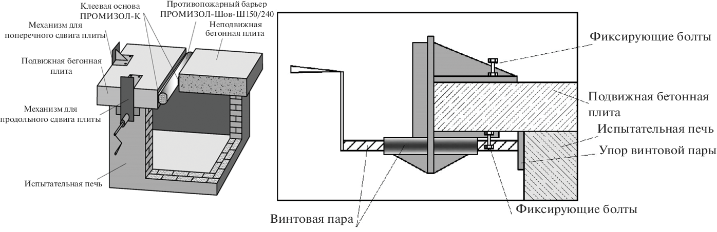This article investigates the fire resistance of a structure with a fire barrier based on super-thin basalt fiber for the fire-resistant sealing of joints in reinforced concrete structures under conditions of alternating deformation. In European regulations, such fire barriers are specifically designed for use in expansion joints and operate in the compression, tension, and shear of the joint. In Russia, products and materials that perform the function of a fire barrier are not tested under conditions of alternating load. This article presents a test method for fire resistance for an expansion joint in a reinforced concrete structure. The results are obtained on the parameters of integrity (E) and heat-insulating capacity (I) for reinforced concrete slabs, followed by an increase in the width of the gap between the slabs and their shift relative to each other by +25% of at least 245 min.