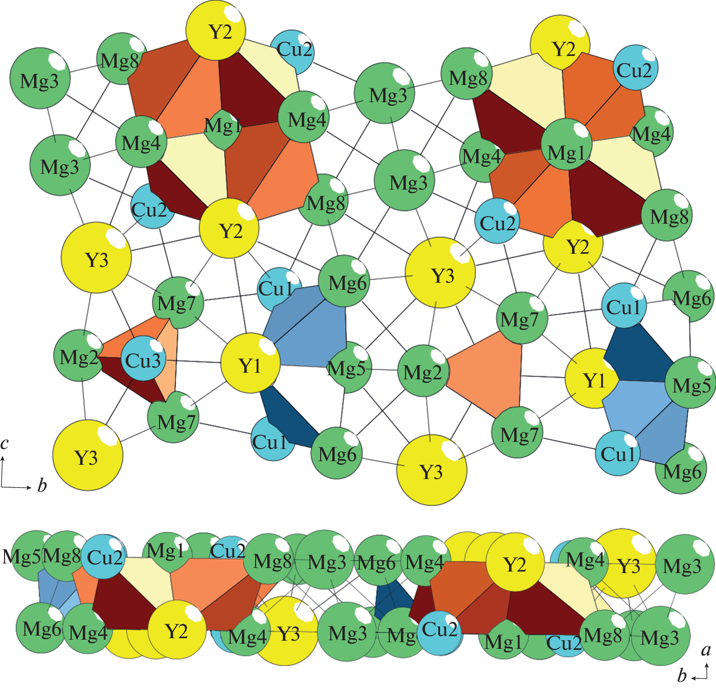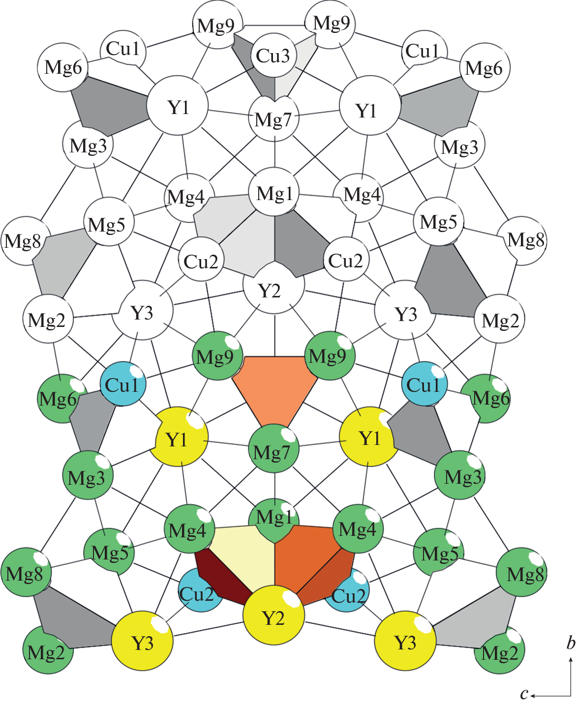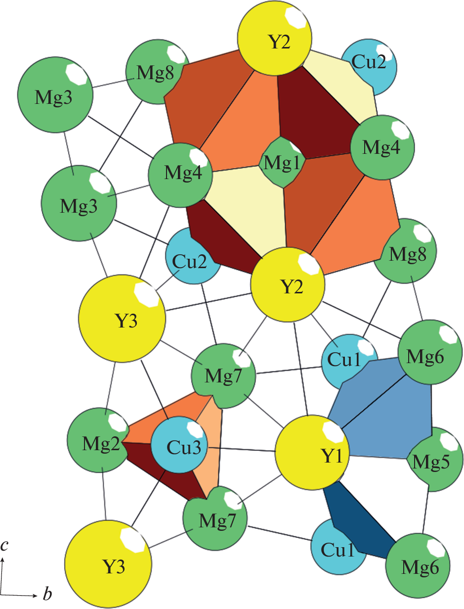 - Solokha P., de Negri S., Pavlyuk V., Saccone A. Inhomogeneous 2D linear intergrowth structures among novel Y–Cu–Mg ternary compounds with yttrium/copper equiatomic ratio // Solid State Sciences. 2009. V. 11. P. 801–811.