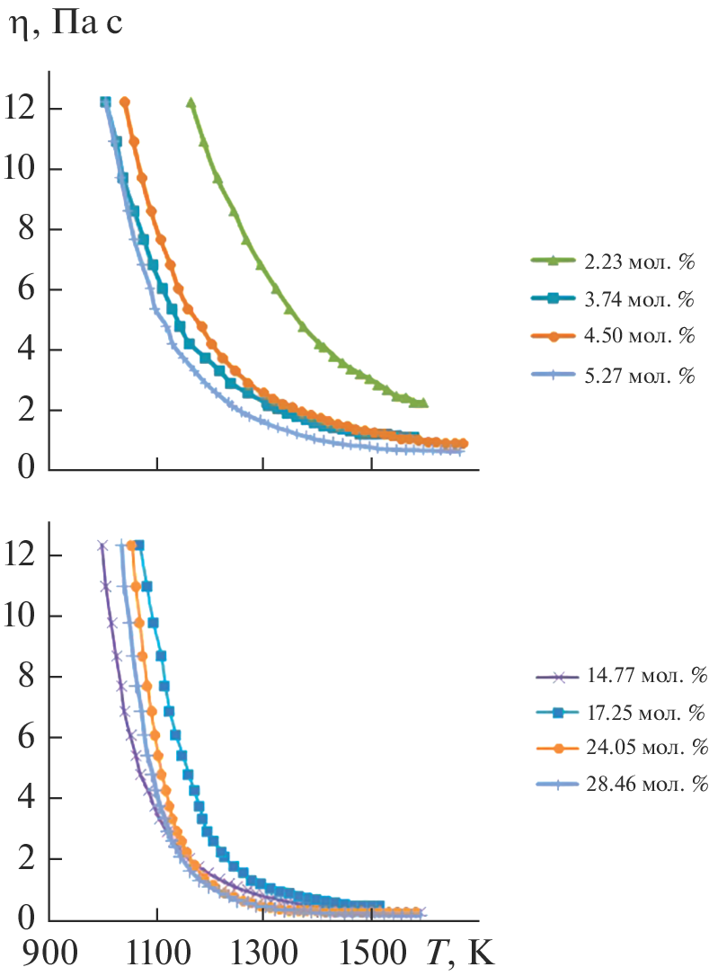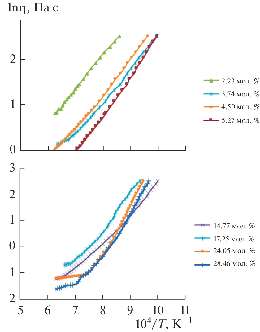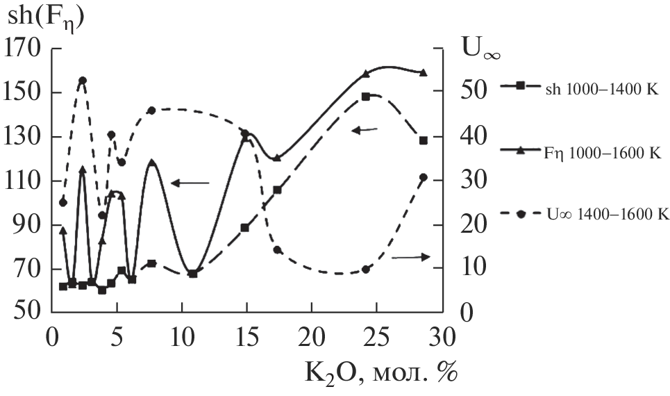 The viscosity of potassium–boron melts is measured in the temperature range 918–1699 K using a vibrational viscosimeter. The content of potassium oxide is varied from 0.74 to 28.46 mol %. The parameters of the viscous flow in melts (the configuration–activation energy(εh) and the shifting energy of the bridging oxygen atoms’ bonds (U∞)) using the configuration–activation model are calculated for two temperature intervals 918–1400 K and 1400–1699 K. The glass transition temperature (Tg) is measured by differential scanning calorimetry (DSC) and the concentration dependence of the glass transition temperature on the content of potassium oxide in the melt is shown.