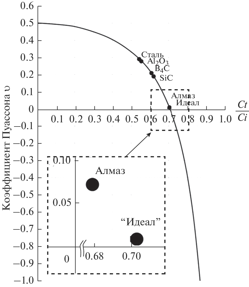 In this paper, a new diamond–silicon carbide ceramic composite material—Ideal—is studied and its mechanical characteristics are determined. For the first time, a comprehensive determination of Poisson’s ratio, shear modulus, bulk modulus, and transverse sound velocity is carried out. Poisson’s ratio is in the region of 0.008 to 0.01, which, in turn, indicates the absolutely brittle nature of the failure of the Ideal ceramic under loading. The criteria that allow evaluating different materials used for body armor are calculated.