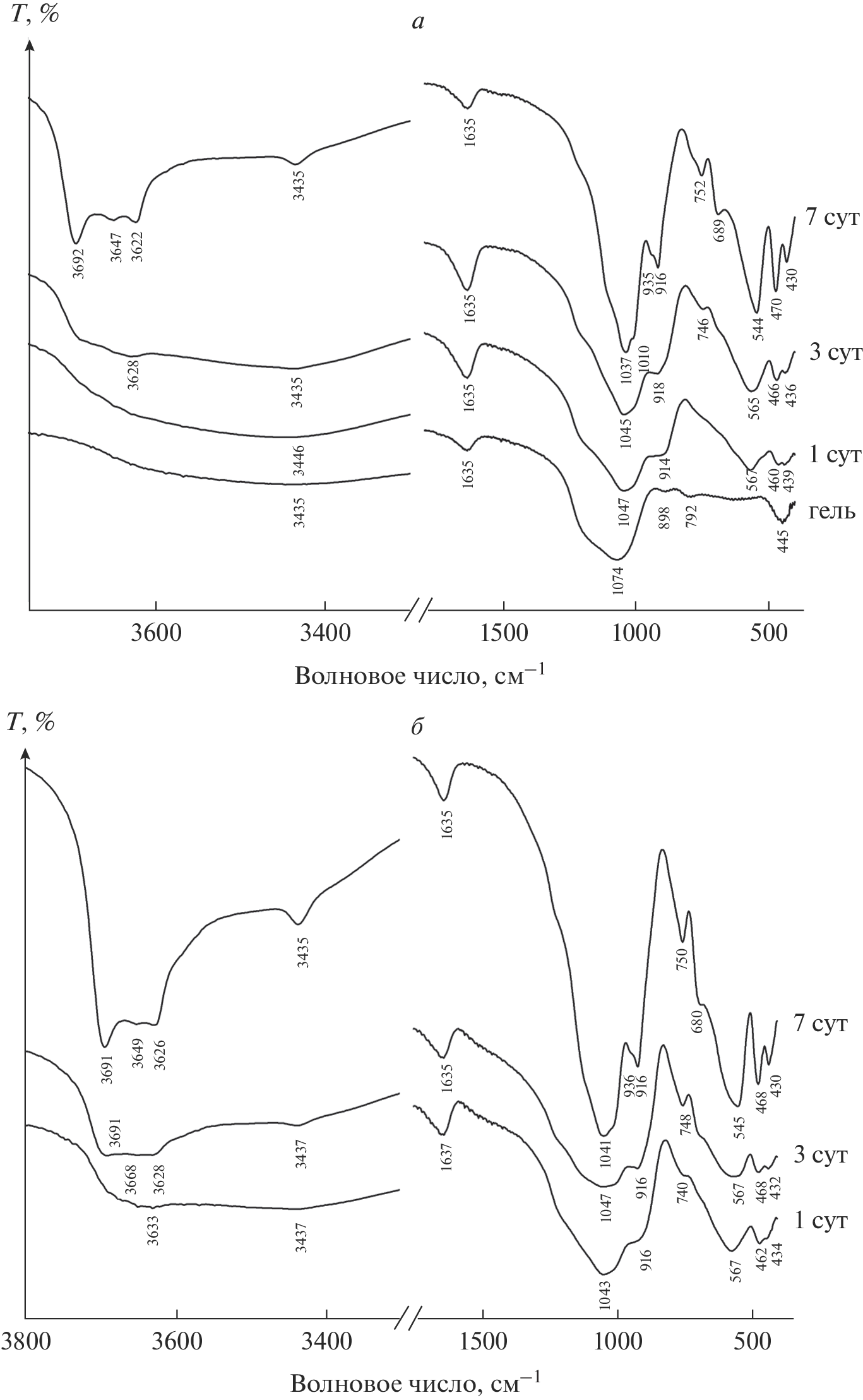 The data of X-ray diffraction and IR spectroscopy of synthetic aluminosilicates of the kaolinite subgroup with different degrees of crystallinity are analyzed. The samples are obtained under hydrothermal conditions in alkaline and neutral media with different durations of synthesis. It is shown that as the synthesis time increases a gradual transition of the amorphous phase to the crystalline phase is observed, which is reflected in the IR spectra by the shift of the bands related to the oscillations of the groups in the octahedral and tetrahedral grids. The first band of stretching vibrations of hydroxyl groups at 3628 cm–1 appears after three days of hydrothermal treatment in a neutral medium, and under alkaline conditions with the same duration of treatment, two more bands are observed at 3687 and 3668 cm–1. The detected changes in the IR spectra correspond to the appearance of the characteristic X-ray reflections of halloysite according to the XRD data. Thus, IR spectroscopy can be considered as a method for a qualitative assessment of the degree of crystallinity.