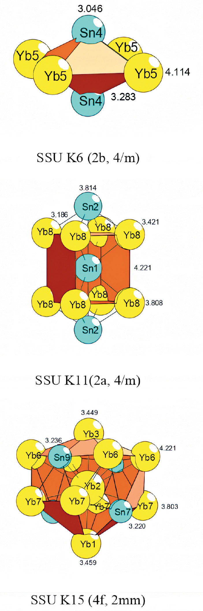 Рассматривается вариант самосборки кристаллической структуры с участием трех кластеров, формирующих слои: из октаэдров K6 = 0@6(Yb4Sn2) с симметрией g = 4/m (центр в позиции 2b (½, ½,½)), из полиэдров K11=Sn@10(Yb8Sn2) с симметрией g = –1 (центр в позиции 2a (½, ½, ½)), полиэдров K15=Yb@14(Yb10Sn4) с симметрией g = 2 mm (центр в позиции 2b (0, ½, 0.285)) и атомов-спейсеров Yb6, Sn2, Sn4, Sn5, Sn7 (рис. 1–3, табл. 3).