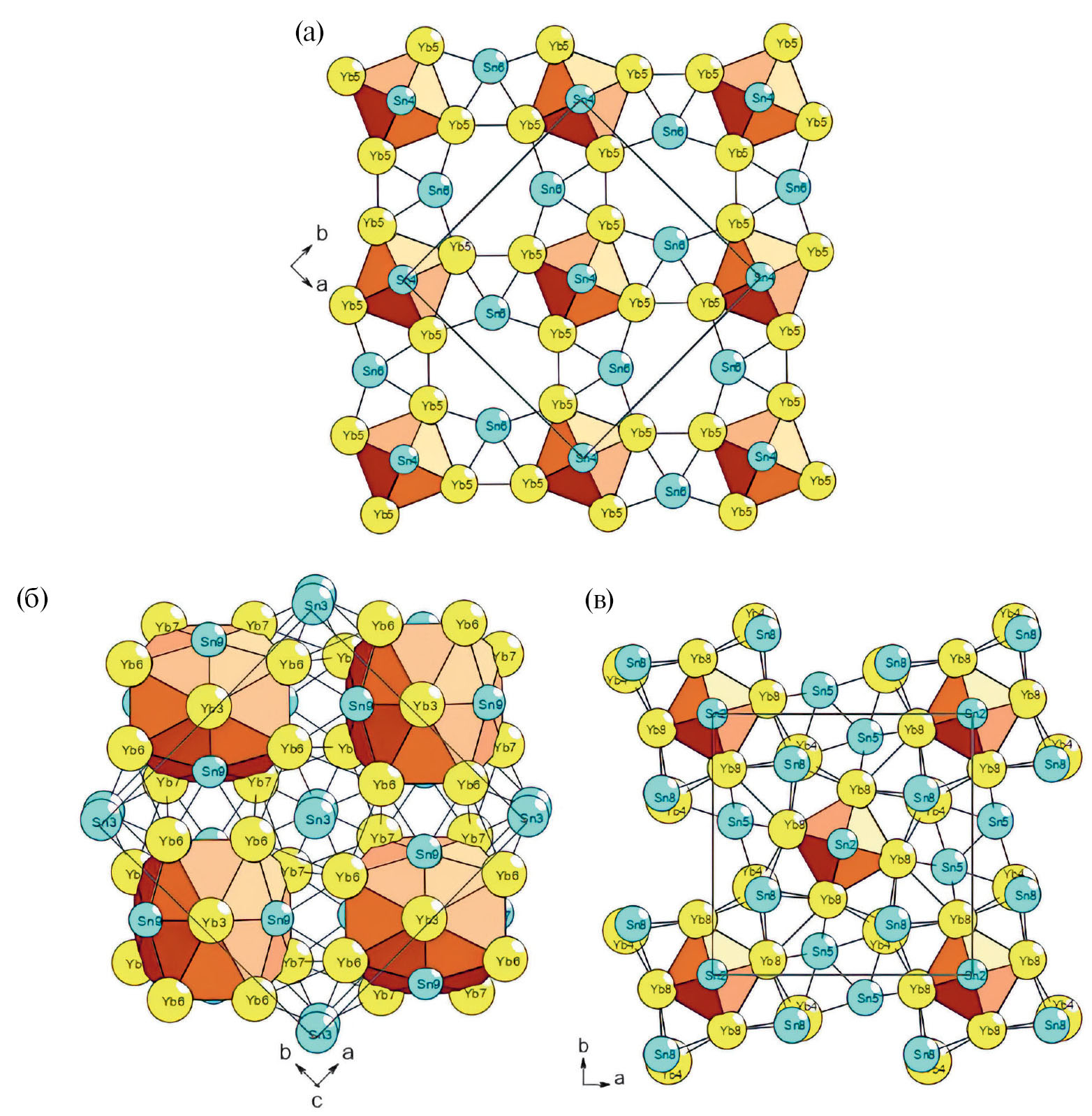 Рис. 2. Yb72Sn46-tP118: (a) слой S32-А, (б) слой S32-Б, (в) слой S32-С.