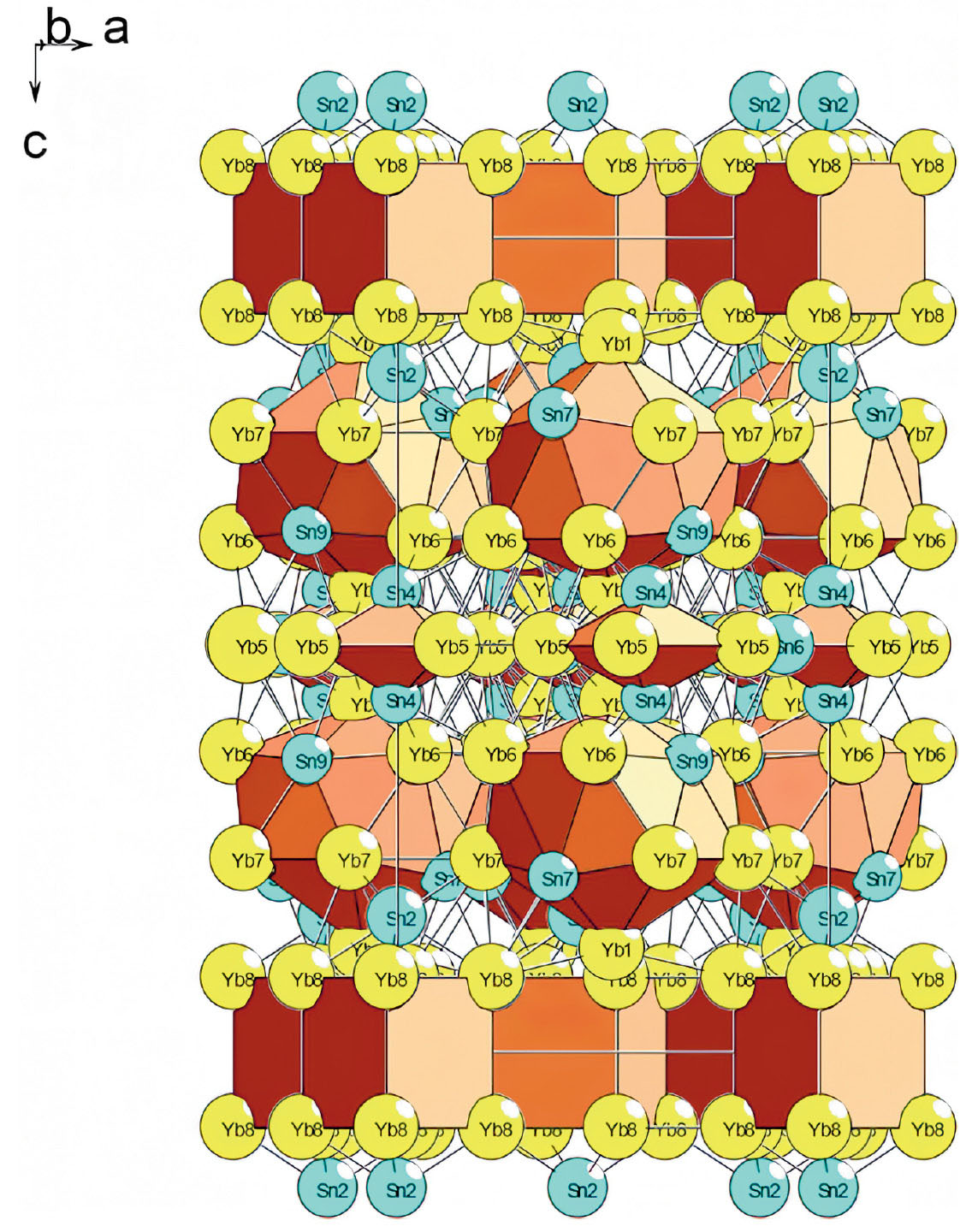 Среди интерметаллидов YbnMm наиболее кристаллохимически сложной является кристаллическая структура Yb72Sn46-tP118 с параметрами элементарной ячейки: a = 11.076 Å, c = 36.933 Å, V = 4530.86 Å3, пр. группа P 4/mbm [10]. Последовательность Вайкоффа для 17 кристаллографически независимых атомов — 8 атомов Yb и 9 атомов Sn — имеет вид l3 k3 j2 h g2 f3 e3 b a. Координационные числа атомов Yb — 13, 14, 15, атомов Sn — 9, 10, 11. Тип каркас-образующих кластеров-прекурсоров для интерметаллида Yb72Sn46-tP118 неизвестен.