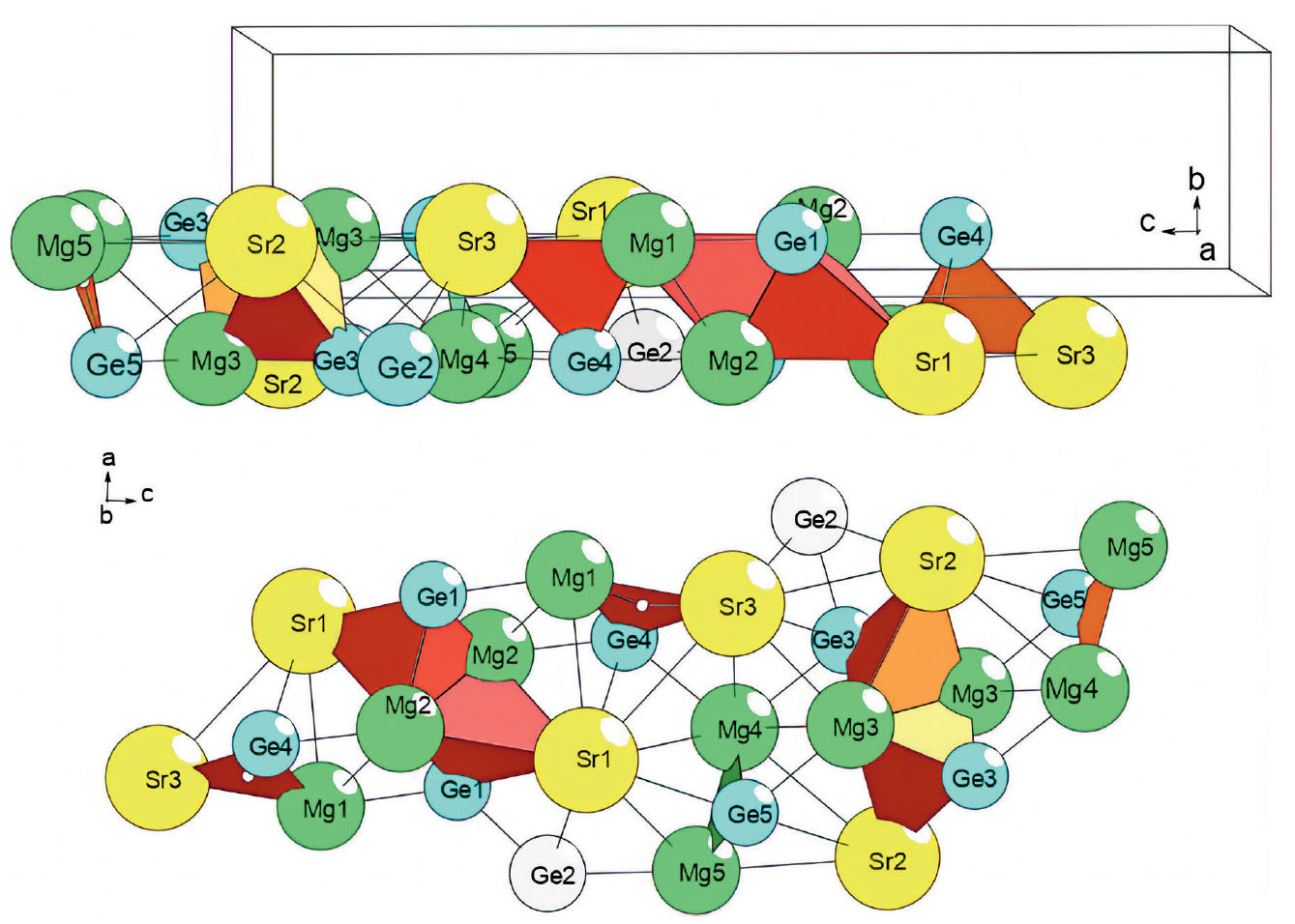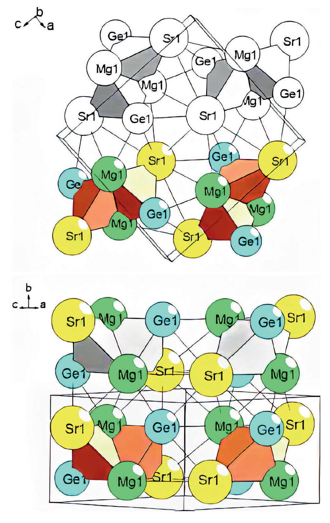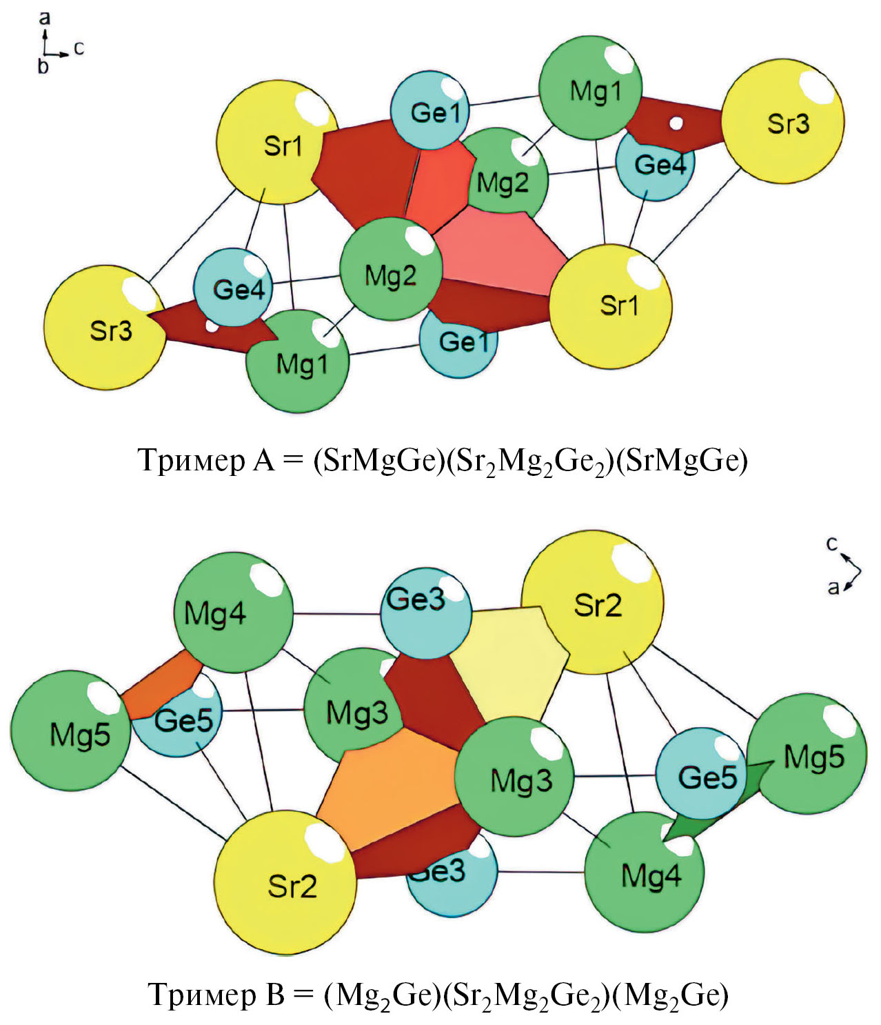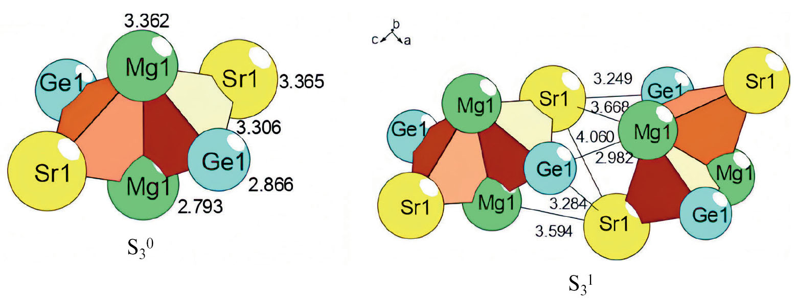 Установлено два супраполиэдрических кластера — тример A, состоящий из трех чередующихся кластеров (SrMgGe)(Sr2Mg2Ge2)(SrMgGe), и тример B, состоящий из трех чередующихся кластеров (Mg2Ge)(Sr2Mg2Ge2)(Mg2Ge) (рис. 2).
