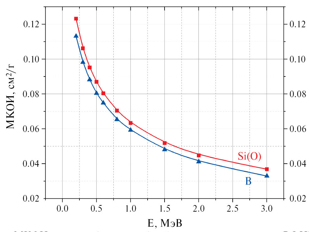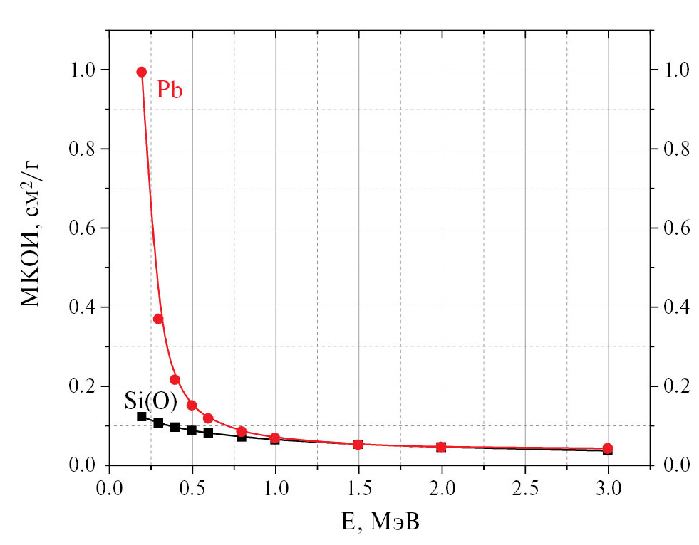Рис. 1 демонстрирует эти зависимости, построенные по данным [7], для бора и кремния. Кривая для кислорода практически совпадает с таковой для кремния (на рис. 1 это обозначено как Si (O)), а кривая для фосфора, будь она показана на рис. 1, располагалась бы между ними (см. табл. 1). Видно, что различия в приведенных кривых на рис. 1 незначительны: у бора значения МКОИ чуть ниже, чем у поименованных выше элементов. Однако при замене бора на свинец кривые МКОИ при разных значениях Е у свинца и кремния (кислорода, фосфора и т. д.) сильно различаются в области энергий от 0.2 до примерно 1.0 МэВ (рис. 2). Что же касается области энергий, превышающих 1.0 МэВ, то из рис. 2 видно, что свинец ведет себя в ней практически так же, как и кремний (кислород, фосфор и т. д.).