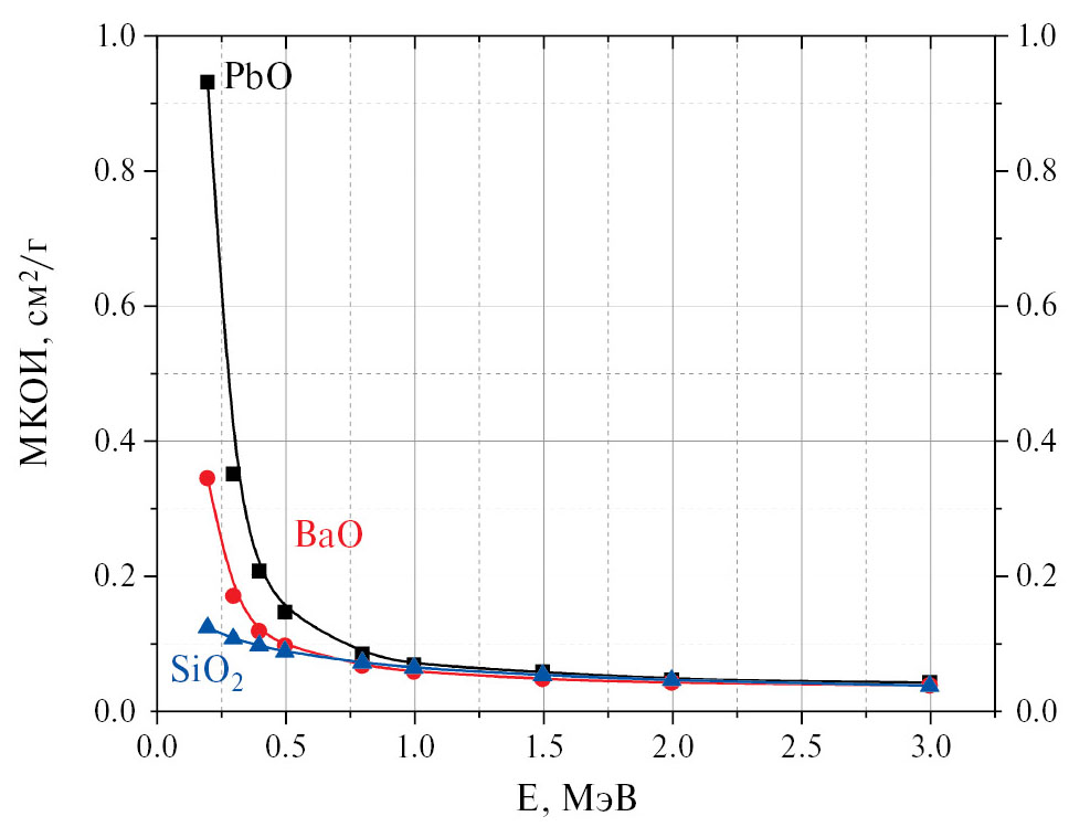 Как следует из табл. 3, при Е = 0.3 МэВ значение МКОИ у PbO равно 0.3500 см2/г, у ВаО — 0.1696 см2/г, а у SiO2 — всего 0.1060 см2/г (при Е = 0.2 МэВ эта разница оказывается еще более значимой: 0.9903, 0.3438 и 0.1224 соответственно), тогда как начиная с диапазона энергий от 0.65 (кривые для BaO и SiO2 на рис. 3) или от 1.15 МэВ (кривая для PbO) все три кривые с ростом Е демонстрируют достаточно близкие значения МКОИ. Это говорит о том, что в области энергий квантов ВФИИ, превышающих 1.0 МэВ, оптические стекла разных марок должны демонстрировать качественно одинаковый ход зависимости ЛКОИ от энергии квантов ВФИИ.