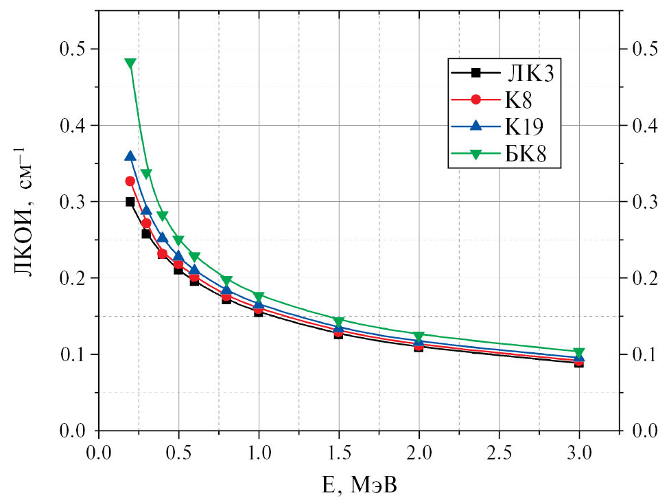 Состав стекла ЛК3 — самый простой, он представлен оксидами SiO2, B2O3, K2O и легким фтором [здесь и далее 16]. В стекле К8, кроме этих оксидов и оксида натрия, имеется 2.65 мас.% ВаО, поэтому в области энергий до 1.0 МэВ его ЛКОИ увеличивается быстрее при движении в сторону меньших энергий, чем ЛКОИ стекла ЛК3. В стекле К19 концентрация ВаО уже равна 5.57, а у стекла БК8–20.02 мас.%. Столь заметное увеличение концентрации ВаО в сравниваемых стеклах при переходе от К8 к К19 и БК8 как раз и вызывает более стремительный рост ЛКОИ стекол по мере уменьшения энергии квантов ВФИИ.