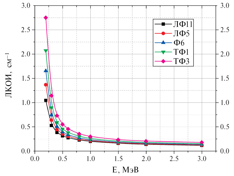 Было установлено, во-первых, что стекла-аналоги одной марки (к примеру, К8, К108 и К208, равно как и пары или тройки стекол-аналогов других марок) обладают практически одинаковыми значениями ЛКОИ во всем диапазоне изменения Е и, во-вторых, что с ростом плотности стекол при переходе от одного стекла к другому их значения ЛКОИ возрастают. Далее, с учетом данных [8–11] в [6] было отмечено, что стекла с более высокой плотностью, а стало быть, и с более высокими значениями ЛКОИ, сильнее окрашиваются под действием рентгеновского или гамма-излучения, чем стекла с меньшей плотностью. Понятно, что это обстоятельство играет важную роль при выборе стекол для радиационно-стойких оптических приборов.