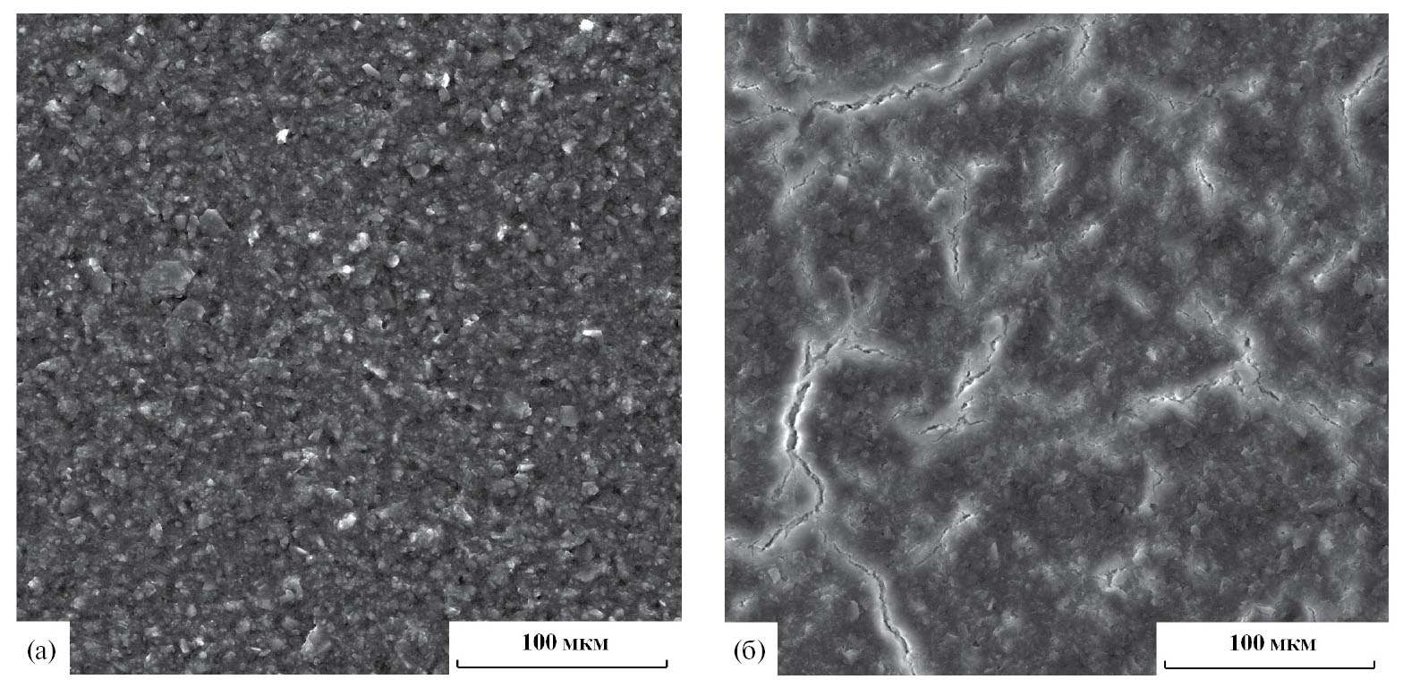 Рис. 1. Электронные микрофотографии поверхности покрытия на основе алюмоборосиликатного стекла после выдержки при температуре: 300◦C (а); 700◦C (б). Увеличение × 2400.