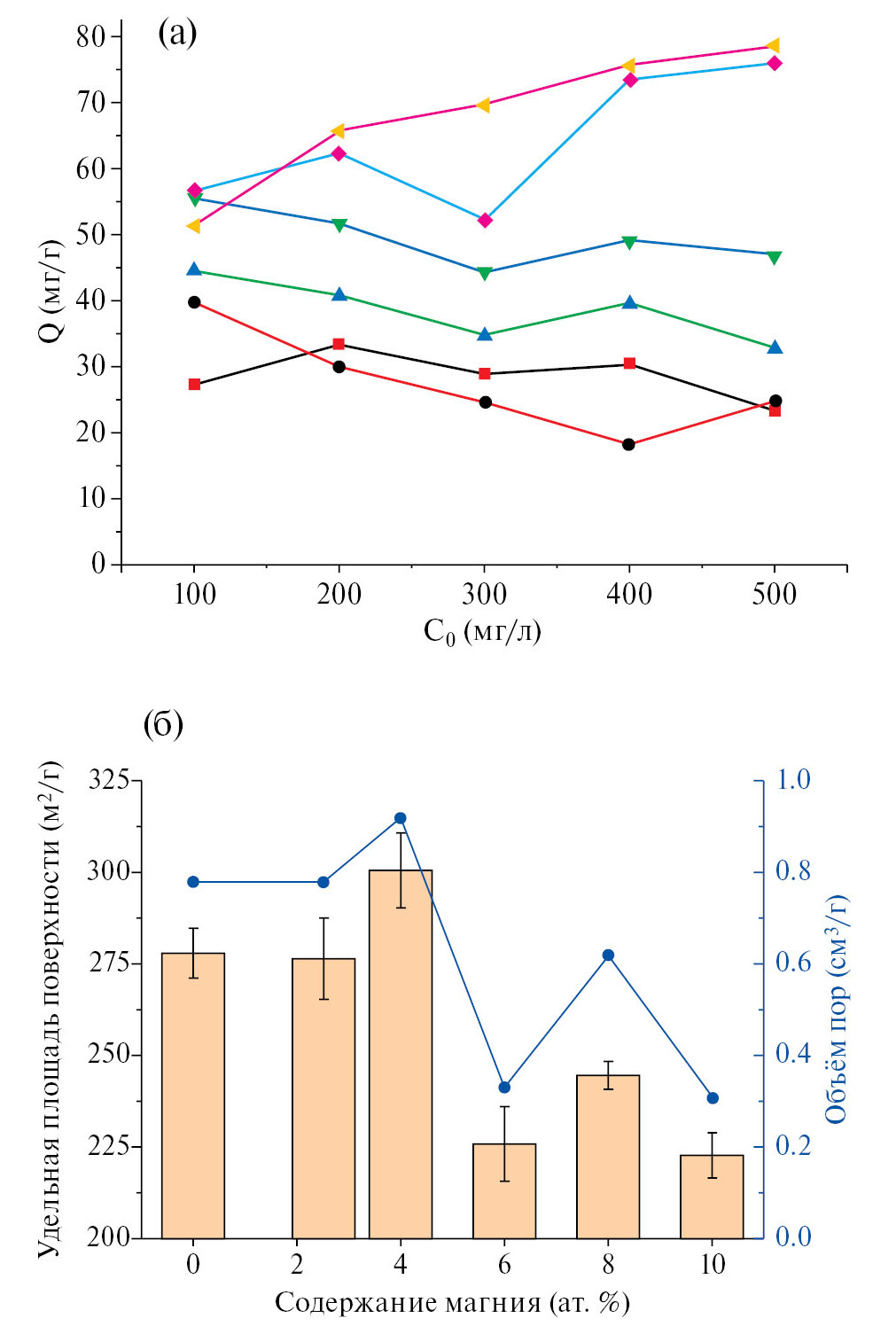 Для проведения эксперимента по сорбции ионов стронция были отобраны 6 проб полученных ранее составов массой 20 мг с замещением титана магнием от 0 до 10 ат.%. Далее данные композиции будут обозначаться как 0, 2.5, 4, 6, 8 и 10 (в соответствии с рассчитанным процентным содержанием магния). К отобранным образцам приливали 20 мл водного раствора нитрата стронция с концентрациями 100, 200, 300, 400 и 500 мг/л в пересчете на ионы стронция. Полученные растворы подвергали постоянному перемешиванию в течение двух часов для достижения сорбционного равновесия. Затем образец фильтровали и определяли остаточную концентрацию ионов стронция в водном растворе методом атомно-абсорбционной спектрометрии на спектрометре iCE3000. Определение содержания Sr2+ производили в пламени ацетилен — воздух в стехиометрическом соотношении газов (t пламени = 2200◦C). Абсорбционная длина волны для стронция равна 460.7 нм. Погрешность измерений для использованных концентраций раствора составляет до 1%.