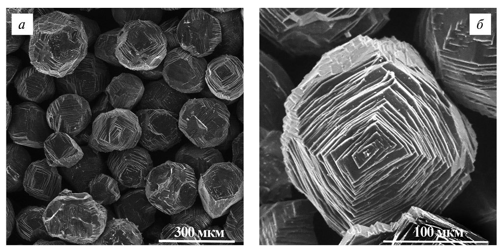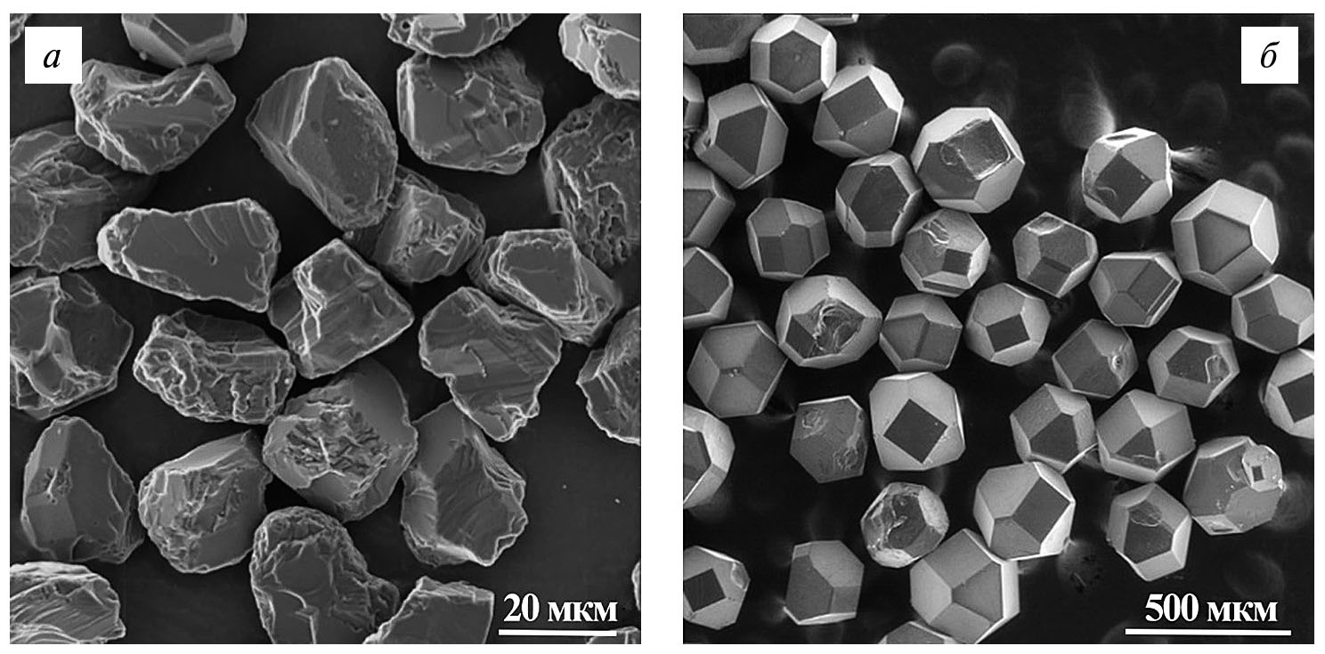 Рис. 2. Микрофотографии SEM исходных частиц алмаза, имеющих форму кубооктаэдра (а) и усеченного октаэдра, с наиболее развитыми кубическими {100} и октаэдрическими {111} гранями