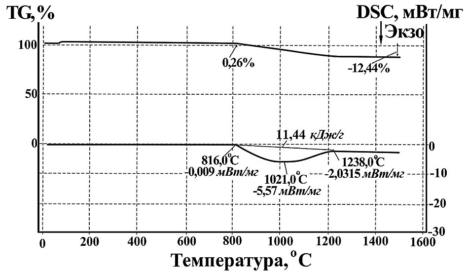 Исследуемые образцы в виде дисков размером Ø5 мм, h = 1 мм, с пористостью 45 об.%, помещали в открытый платиновый тигель. Образцы, испытываемые в защитной среде, нагревали со скоростью 20°C/мин в динамической атмосфере Ar (поток Ar — 50 см3/мин), в интервале температур 30–1500°C с выдержкой при конечной температуре 1 ч. Напуск Ar производили после откачки воздуха печи до 1·10–4 мБар. Образцы, испытываемые на воздухе, нагревали со скоростью 20°C/мин в интервале температур 30–1500°C без выдержки.