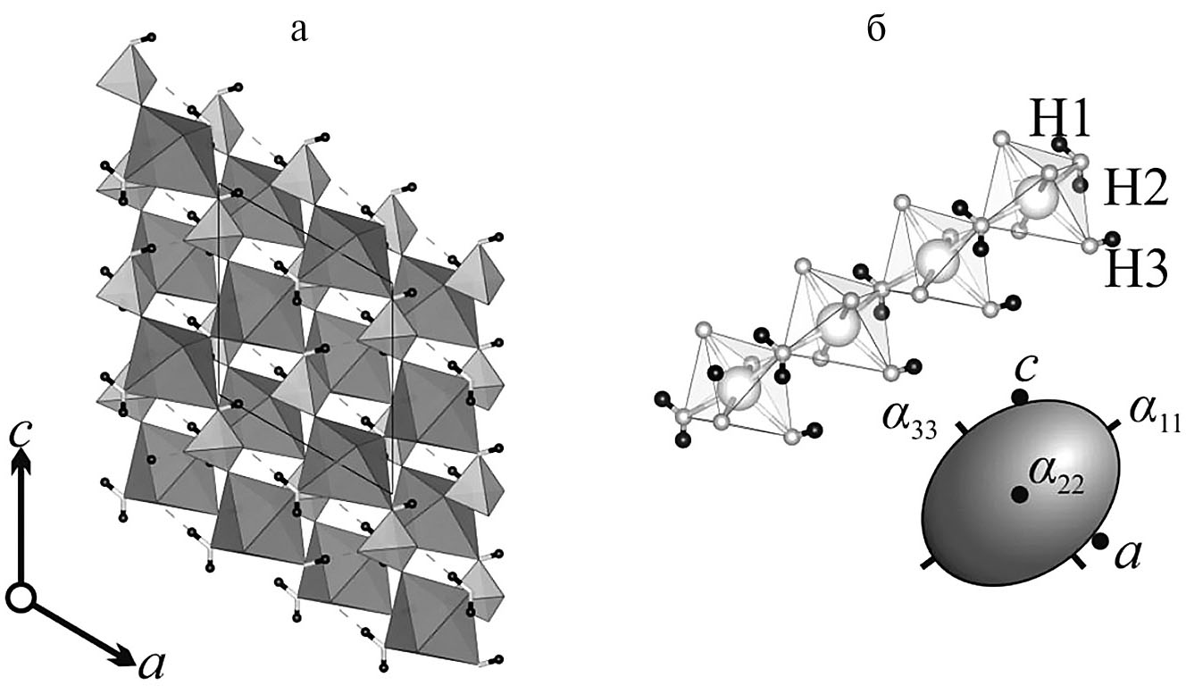 Рис. 5. a) — структура NaHSO4·H2O в плоскости ac; б) — цепочки из октаэдров NaO3(OH)(H2O)2, сопоставленные с фигурой тензора термического расширения