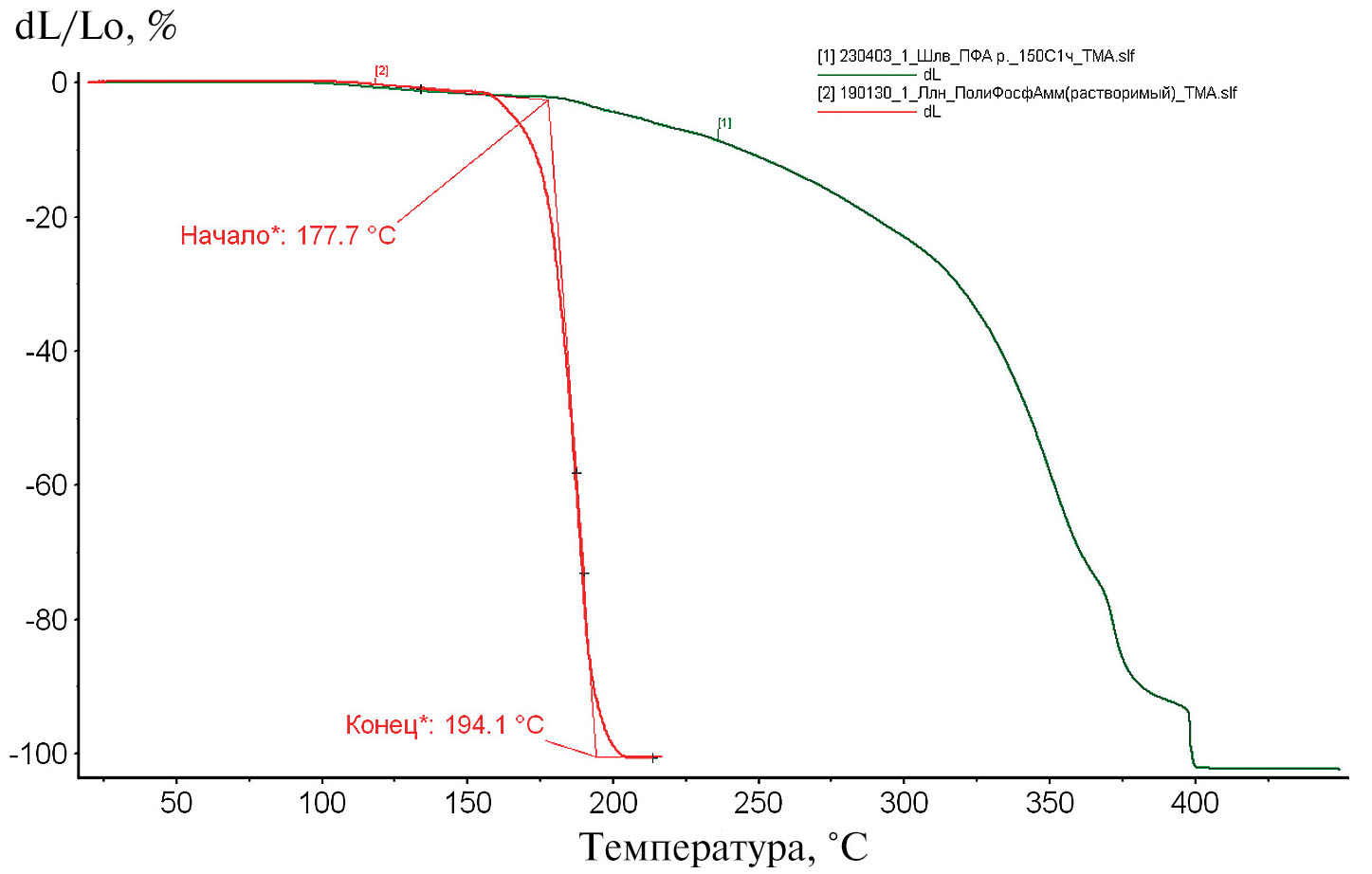В качестве исходных соединений использованы низкомолекулярный полифосфат аммония МАКРОПАК АРР 3, полиэтиленполиамин (содержание азота не менее 30%) («Росхим», Россия). Термическую обработку образцов проводили при подъеме температуры со скоростью 10°/мин в термошкафу с внутренней вентиляцией и последующей выдержкой при заданной температуре в течение 1 ч. Термомеханический анализ проведен на приборе Netzsch-TMA 402/2/G (Netzsch, Германия) при нагрузке 500 mN. Для термогравиметрического анализа использован Netzsch-DSK Jupiter STA 449 F3 (Netzsch, Германия). Скорость изменения температуры составляла в обоих случаях 10°/мин. Тепловые эффекты при низких температурах определены на ДСК фирмы Mettler (Швейцария) при скорости нагрева 10о /мин, масса навески составляла 10–20 мг, при измерениях использованы одноразовые чашки из оксида алюминия объемом 40 микролитров. Влагопоглощение образцов определяли при Т = 20°С в течение 30 дней при влажности воздуха 40–50%. Химический состав продуктов термической деструкции проведен на термовесах SETSYS Evolution (SETARAM). Масс-спектрометрический анализ выполнен на приборе OmniStar (Pfeiffer) при нагреве образца со скоростью 10°/мин в интервале от 30 до 700°С в потоке смеси 5% О2–Не (20 мл/мин). Спектральный анализ проведен на спектрофотометре Carry 50 Varian. Для механических испытаний использована разрывная машина LRX plus Lloyd Instruments (Великобритания).