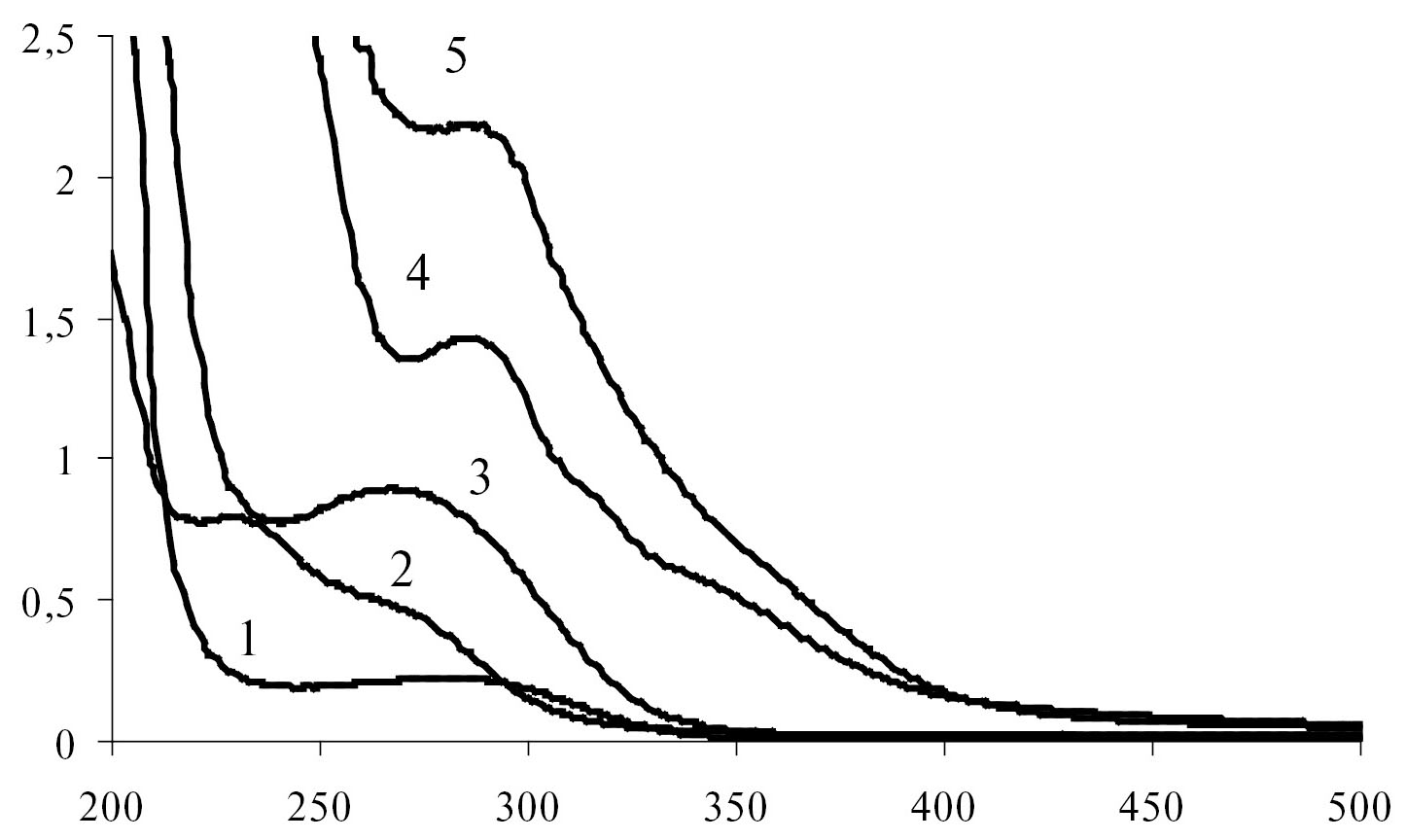 Рис. 4. Спектры поглощения водных растворов ПФА, ПЭПА, фосфорной кислоты и их смесей. ПЭПА (1), фосфорная кислота (2), ПФА (3), фосфорная кислота / ПЭПА (4), ПФА / ПЭПА (5)