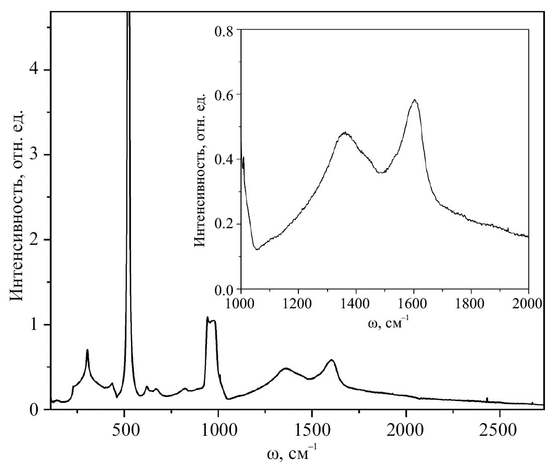 На рис. 3 представлен типичный спектр КРС покрытий на поверхности подложек из монокристаллического кремния. Отметим, что флуоресценция после отжига полностью исчезает. Это свидетельствует об отсутствии углеводородных фрагментов в составе полученных покрытий. Все полосы на спектре КРС с волновым числом менее 1000 см–1 соответствуют колебательным модам монокристаллического кремния. Две полосы в диапазоне 1000–2000 см–1 относятся к углеродной пленке. Сравнение данного спектра с литературными данными позволяет отнести данные полосы к колебаниям углерода в алмазоподобных наноструктурах с диаметром около 5 нм [19]. Отсутствие на спектрах узкой колебательной полосы в районе 1333 см–1, характерной для алмаза, объясняется малыми размерами алмазоподобных наночастиц [19].