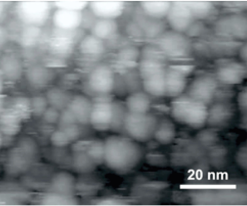 Для подтверждения размеров частиц, формирующих покрытие, проведено исследование морфологии методом СТМ (рис. 4). Очевидно, что наночастицы, формирующие покрытие, имеют размер меньше 10 нм и в среднем составляют 5–7 нм. Таким образом, полученные методами КРС и СТМ данные подтверждают формирование алмазоподобного покрытия на поверхности кремниевой подложки с размером зерен в районе 5–7 нм.