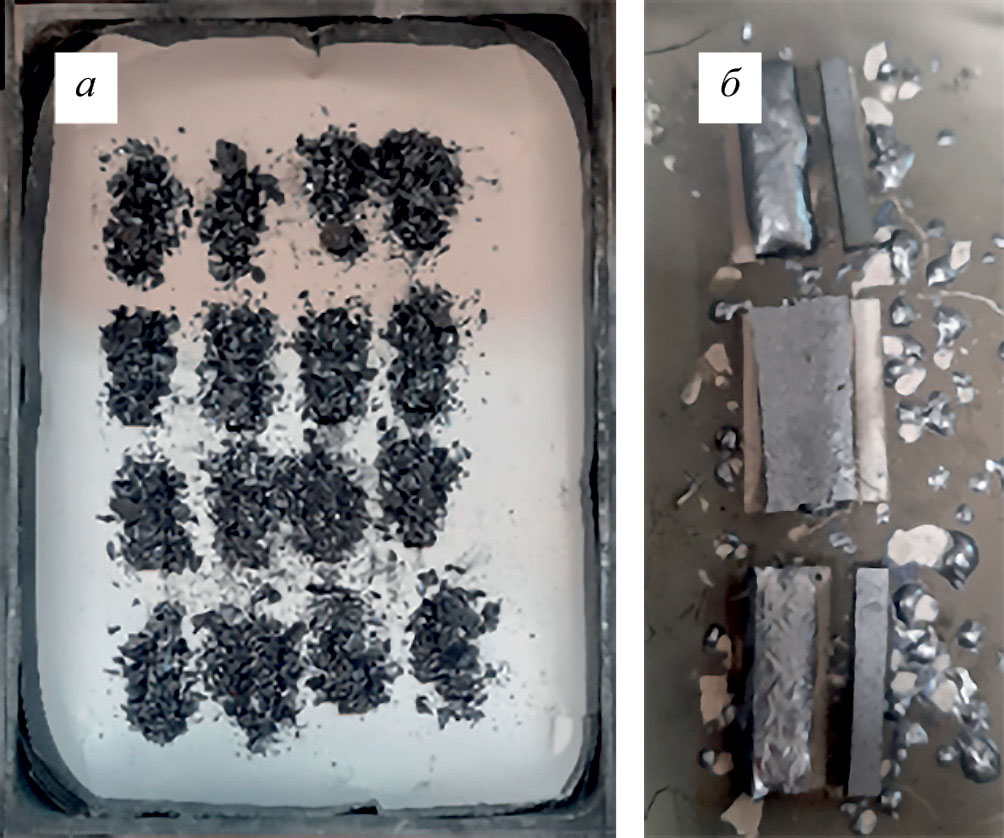Рис. 1. Этапы получения керамических материалов (реакционное спекание): а – обсыпка заготовок образцов кремнием перед реакционным спеканием; б – спеченные образцы до пескоструйной обработки; в – спеченные образцы после пескоструйной обработки